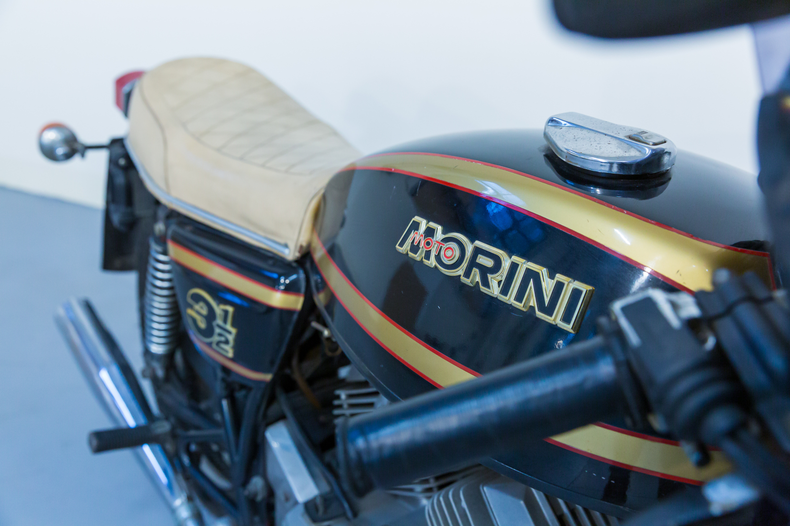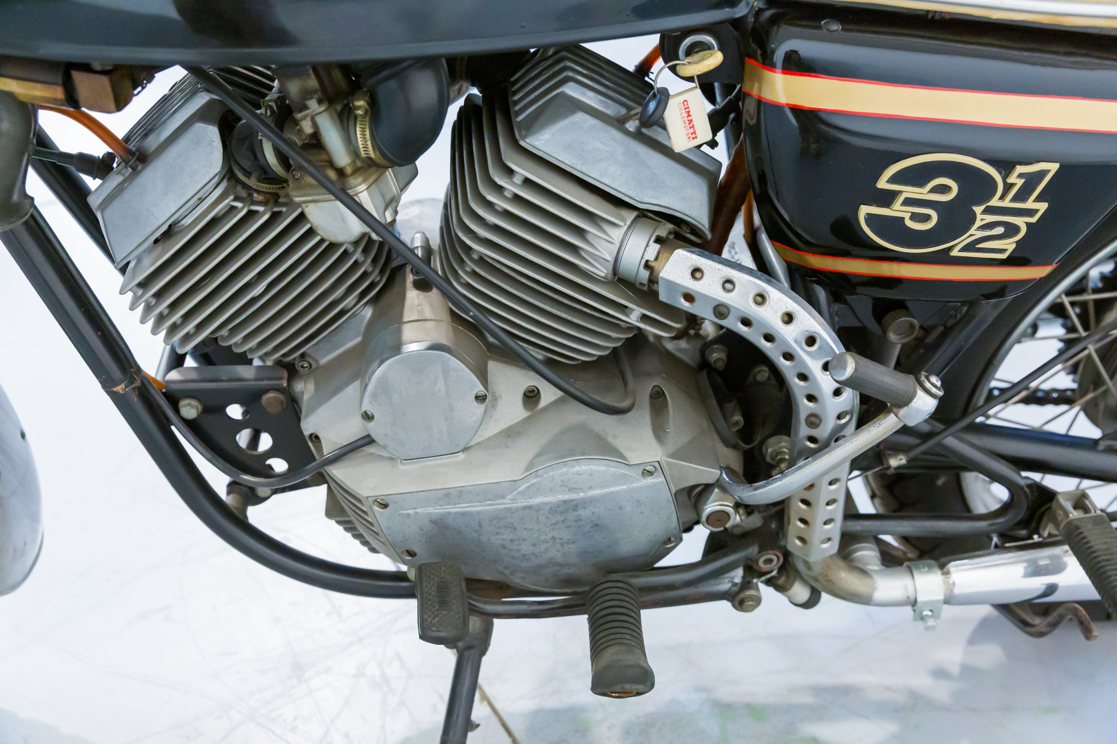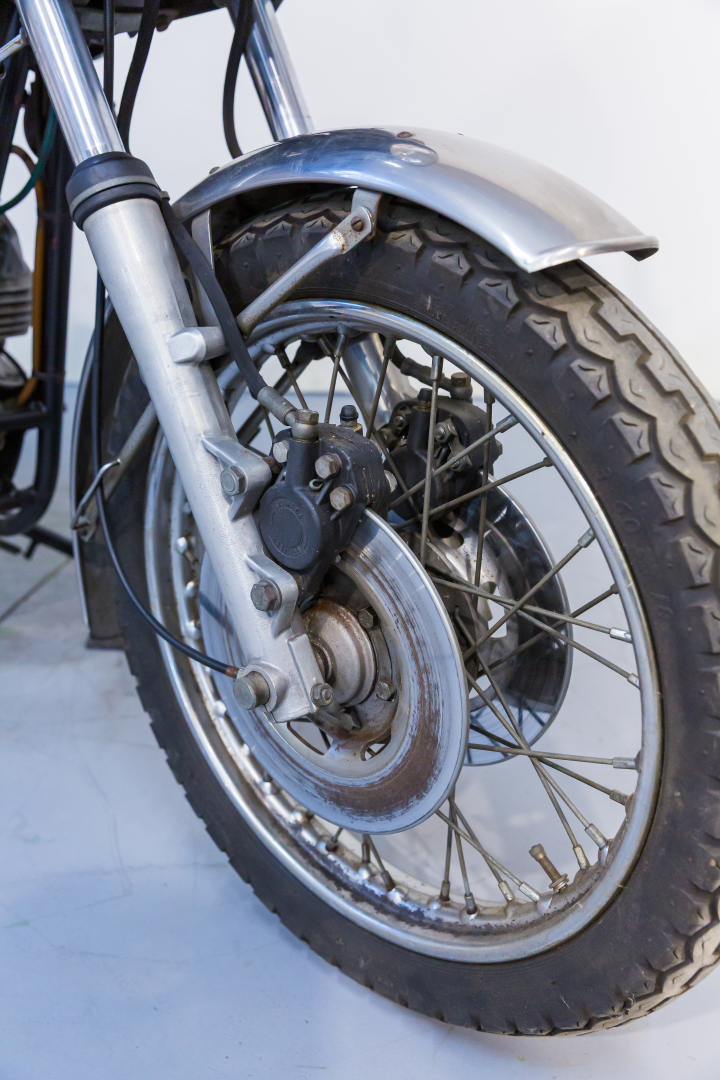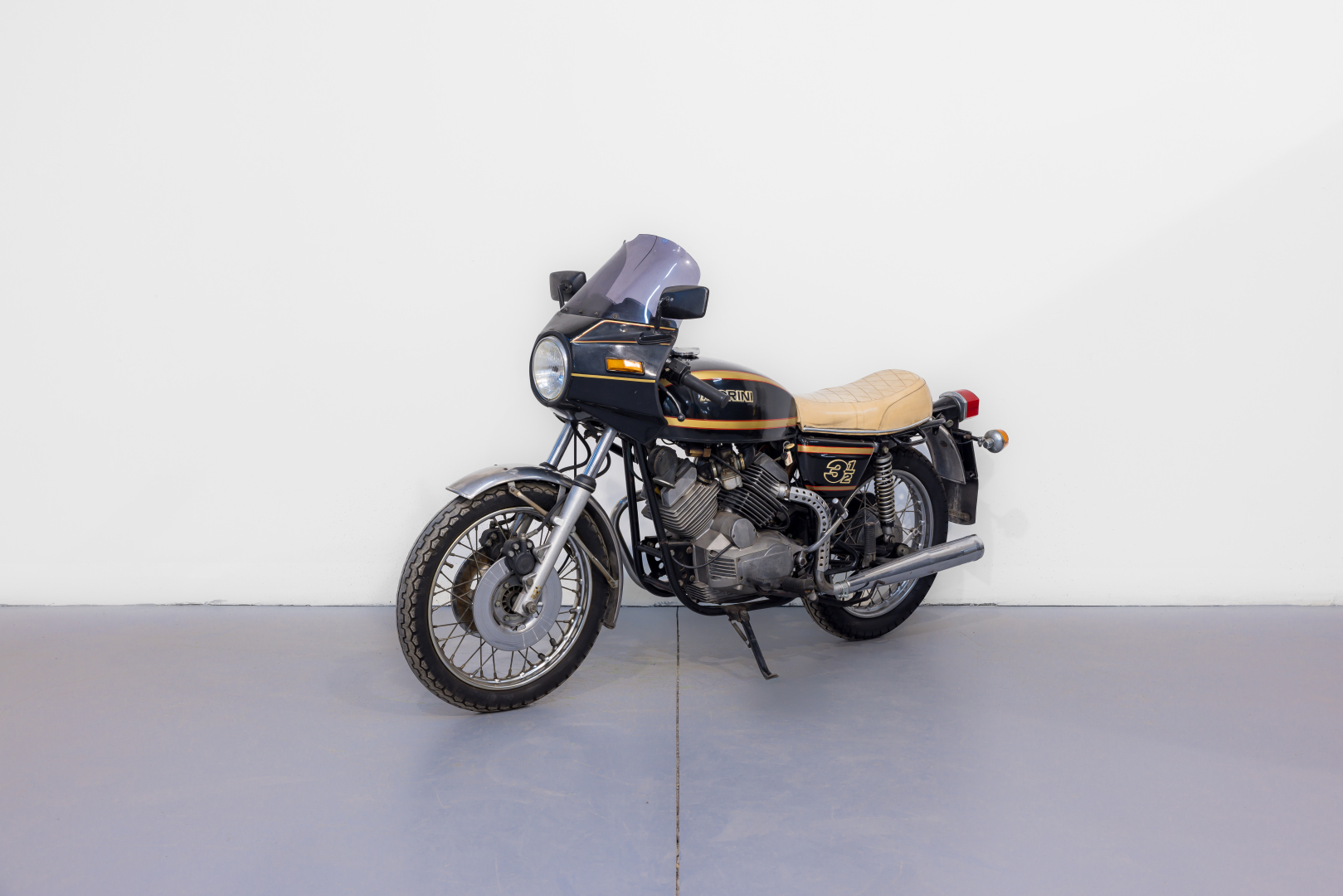 In 1973, Moto Morini, responding to market demands, introduced the 3 ½, a robust motorcycle with a double cradle steel tube frame, telescopic front fork, and rear swingarm with twin tele-hydraulic shock absorbers. The engine is an innovative 72° V longitudinal 4-stroke twin with pushrod distribution and flat Heron-type heads, designed by Ing. Franco Lambertini. Known for brilliant performance and high reliability, this model was very successful and later versions included a hydraulically operated front disc brake. The offered model has some aftermarket components such as the seat and clip-ons. Complete, in fair condition. A general check-up is recommended before use.