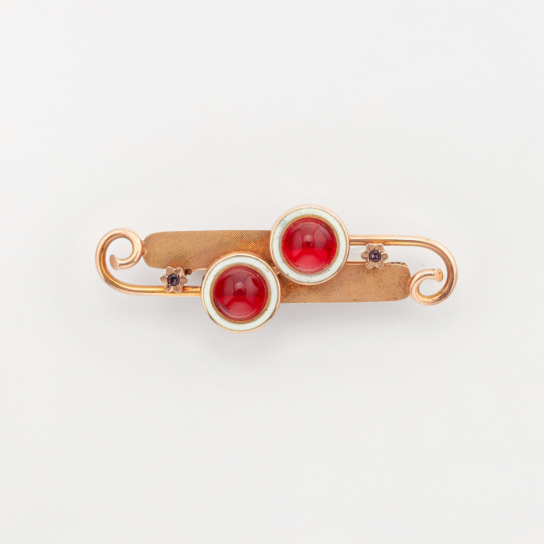14K gold brooch made with a geometric motif and two round red stone cabochons.