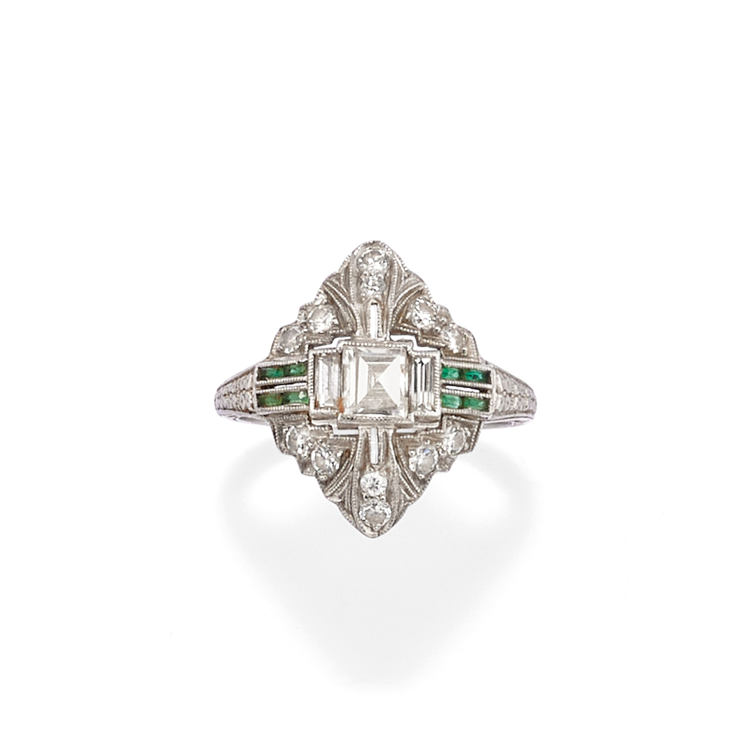 in platinum with old-cut diamonds, baguette-cut diamonds and emeralds. 1920s.