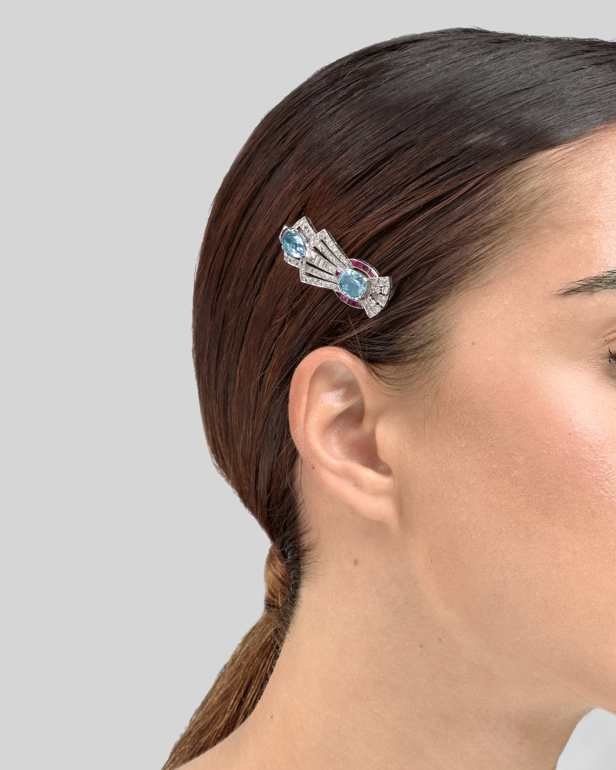 in white gold, with round huit-huit cut and baguette-cut diamonds, a cushion-cut aquamarine weighing approx. 1.75 ct, a pear-cut aquamarine weighing approx. 2.50 ct and rubies. Late Art Deco period. 1940.