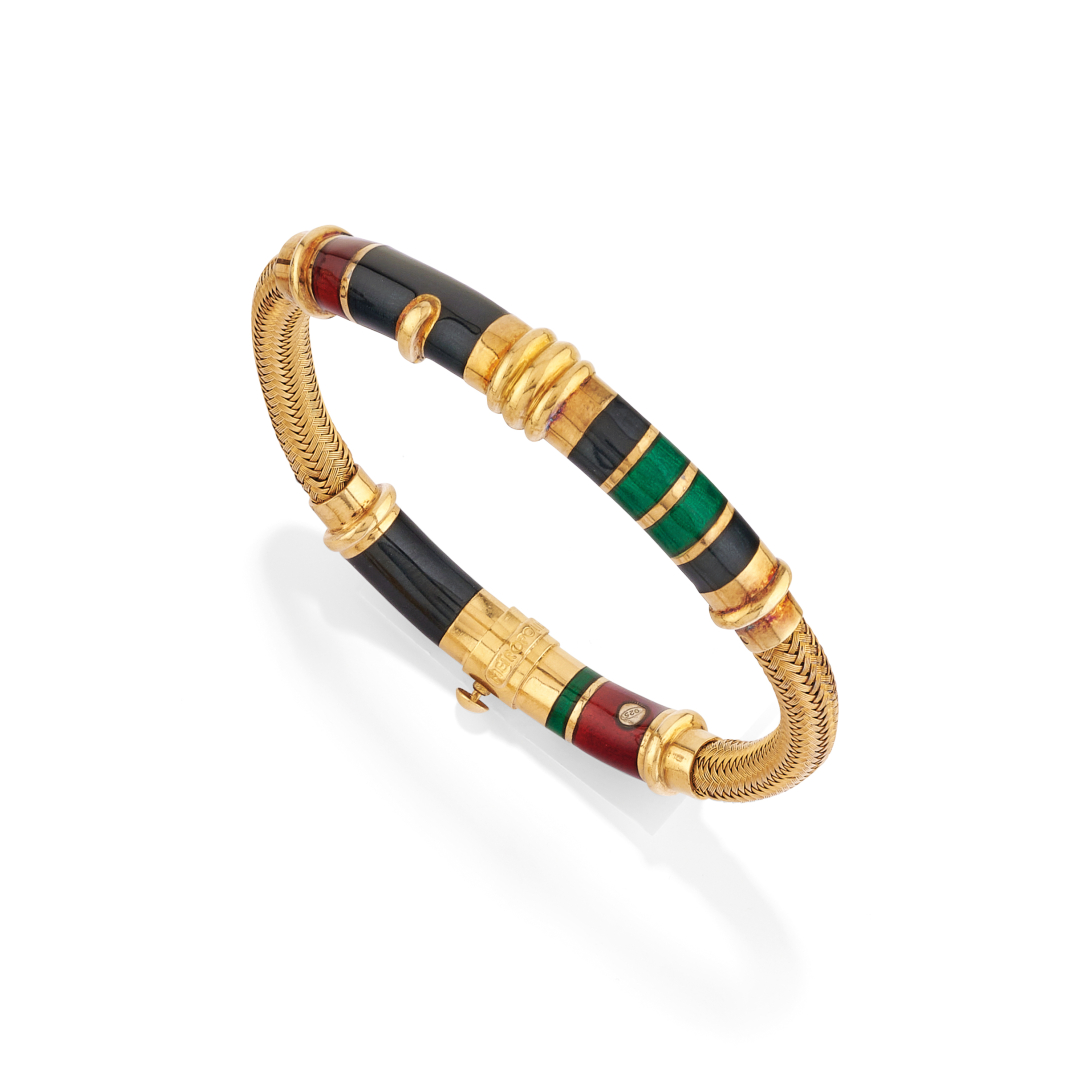in silver and yellow gold with two flexible elements and rigid elements in polychrome enamel. Signed La Nouvelle Bague.