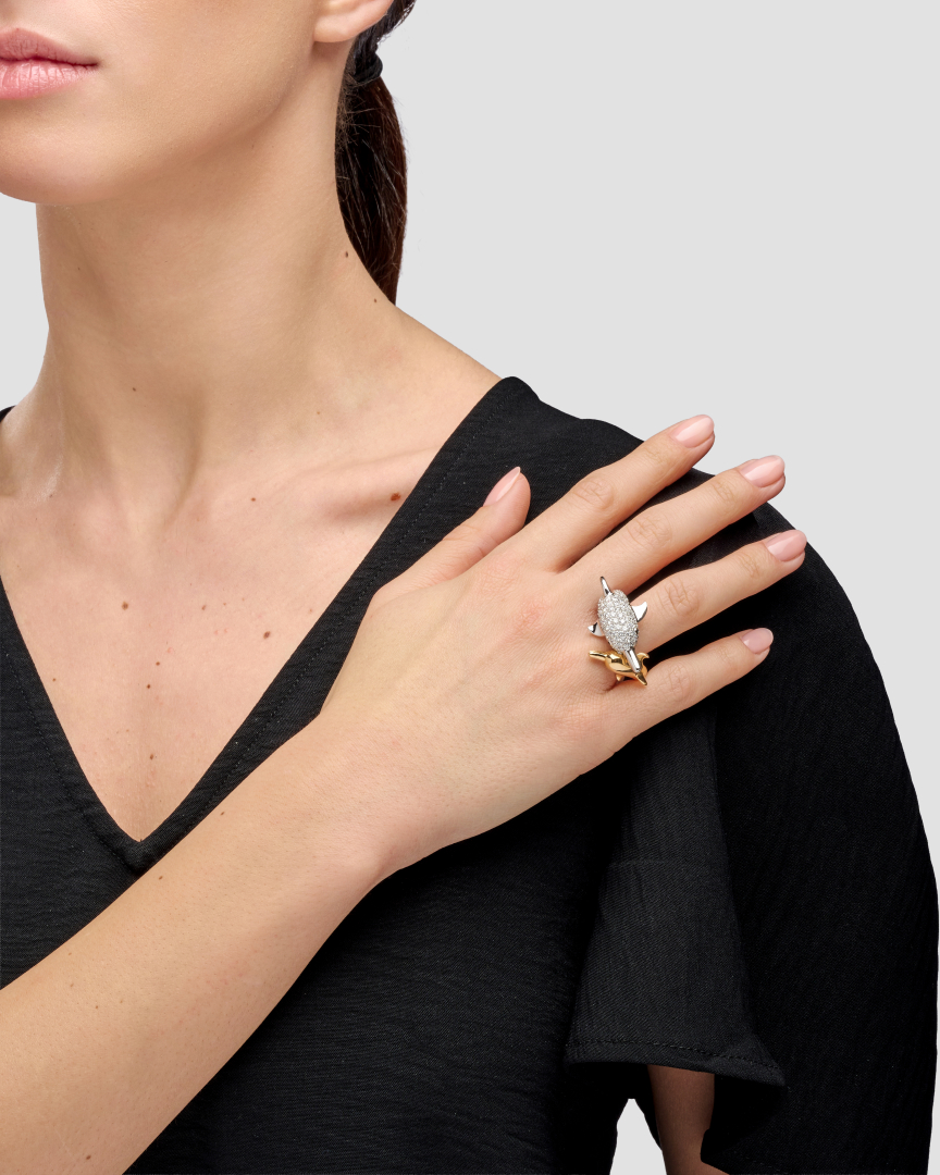 in rose and white gold depicting two dolphins, one pavé-set with diamonds weighing approx. 3.00 ct.