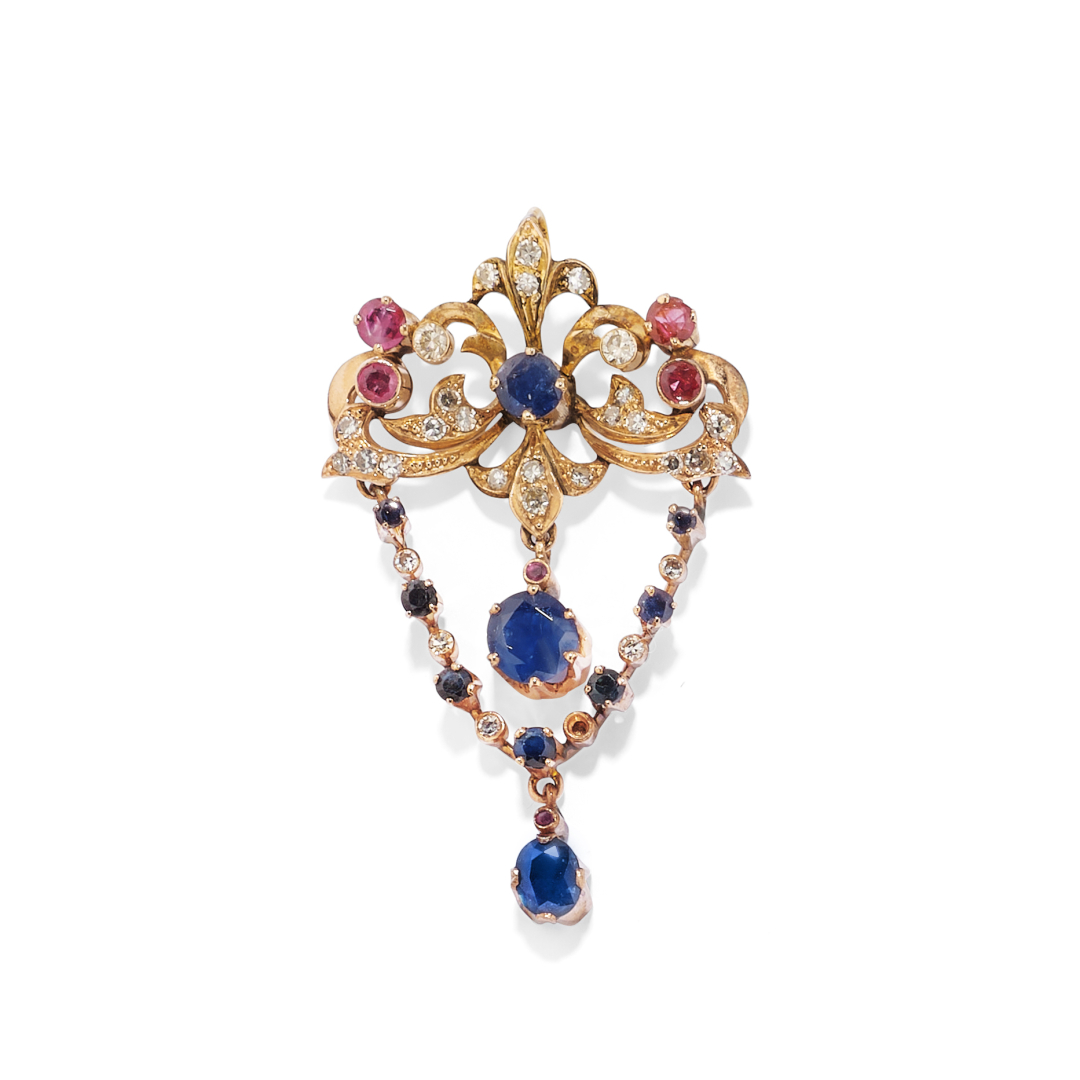 in yellow gold of shield design highlighted with sapphires weighing approx. 1.80 ct, rubies weighing approx. 0.60 ct and diamonds weighing approx. 0.60 ct with sapphire pendent elements. Start of the century, circa 1905.