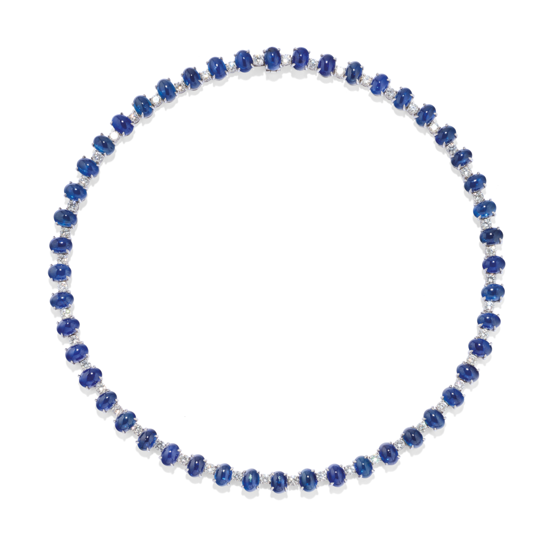 in white gold designed as a row of cabochon sapphires weighing approx. 65.00 ct interspersed with round brilliant-cut diamonds weighing approx. 5.50 ct. Signed Chiappe. With Zendrini certificate.