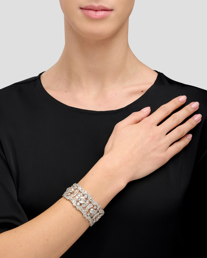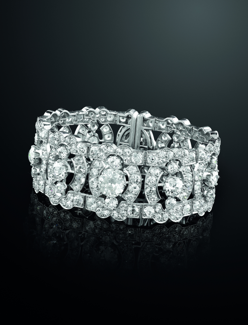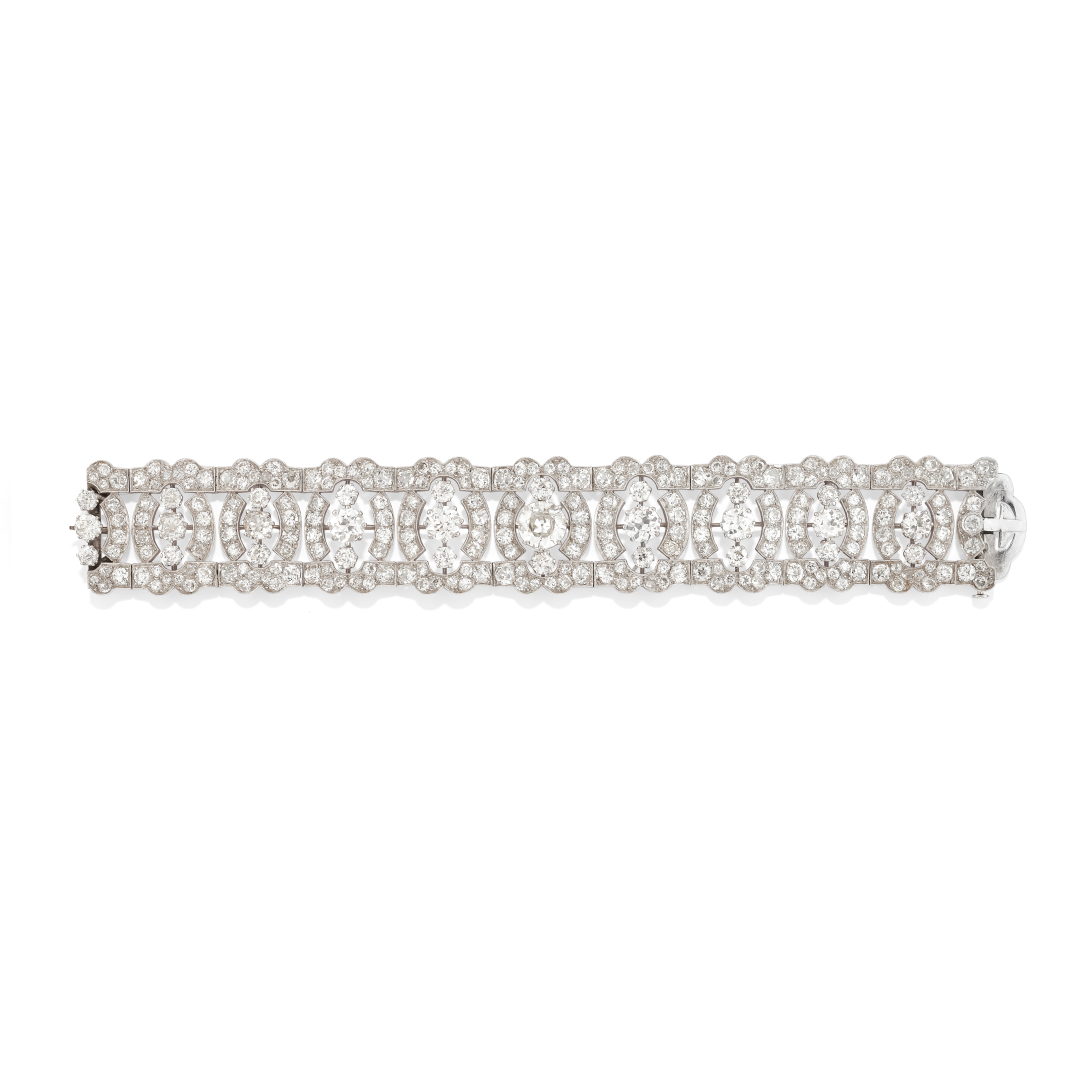 in platinum of nineteenth-century style with repeated geometric elements highlighted with Old Mine- and Old European-cut diamonds weighing approx. 45.00 ct and a central Old European-cut diamond weighing approx. 3.00 ct. Circa 1935-1950.