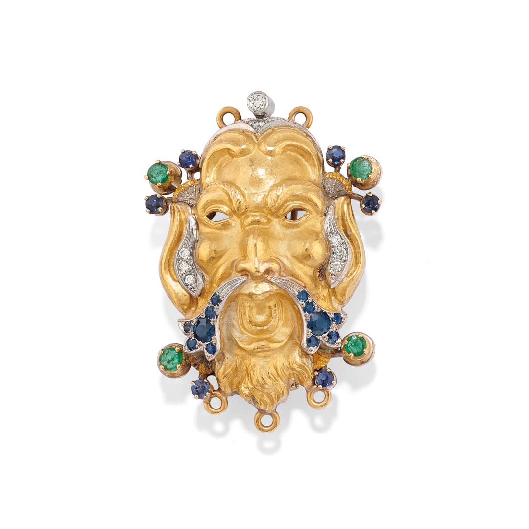 in yellow gold, diamonds and coloured gems, depicting a face. Signed Cazzaniga Roma.