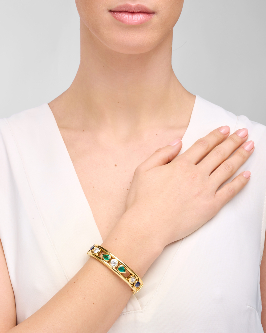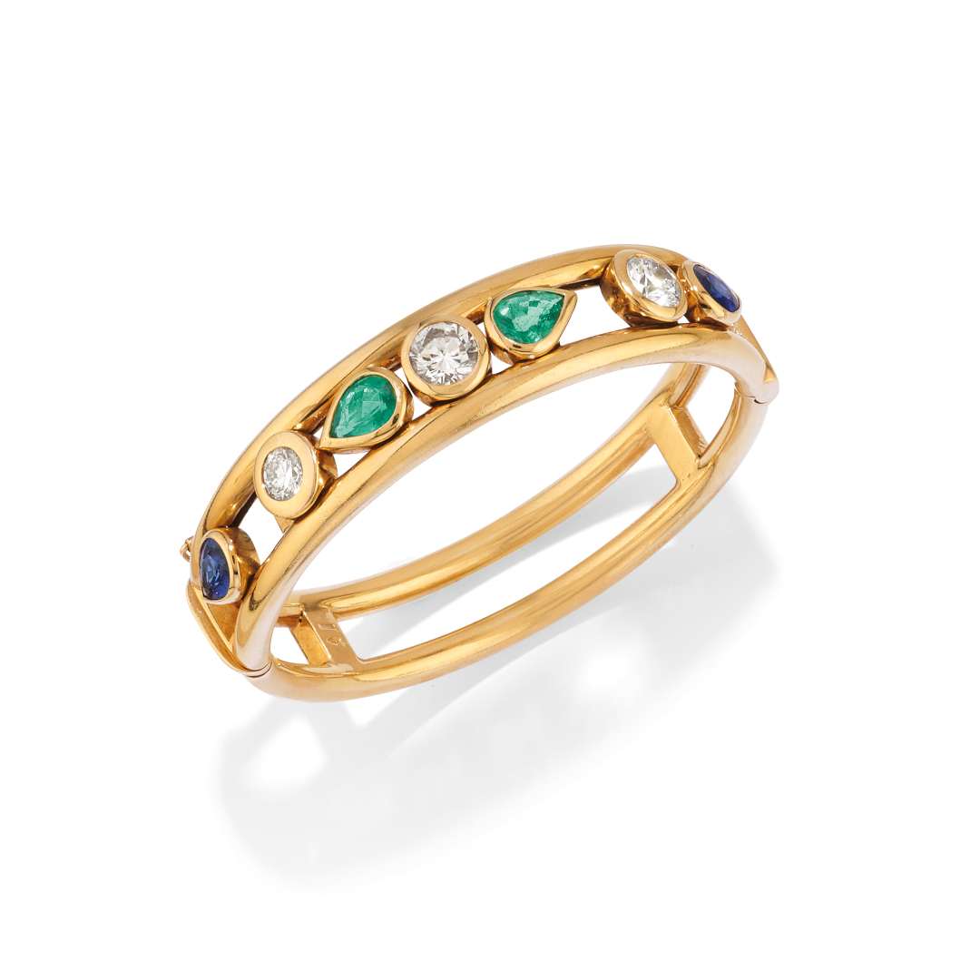 DIAMOND, SAPPHIRE AND EMERALD BANGLE