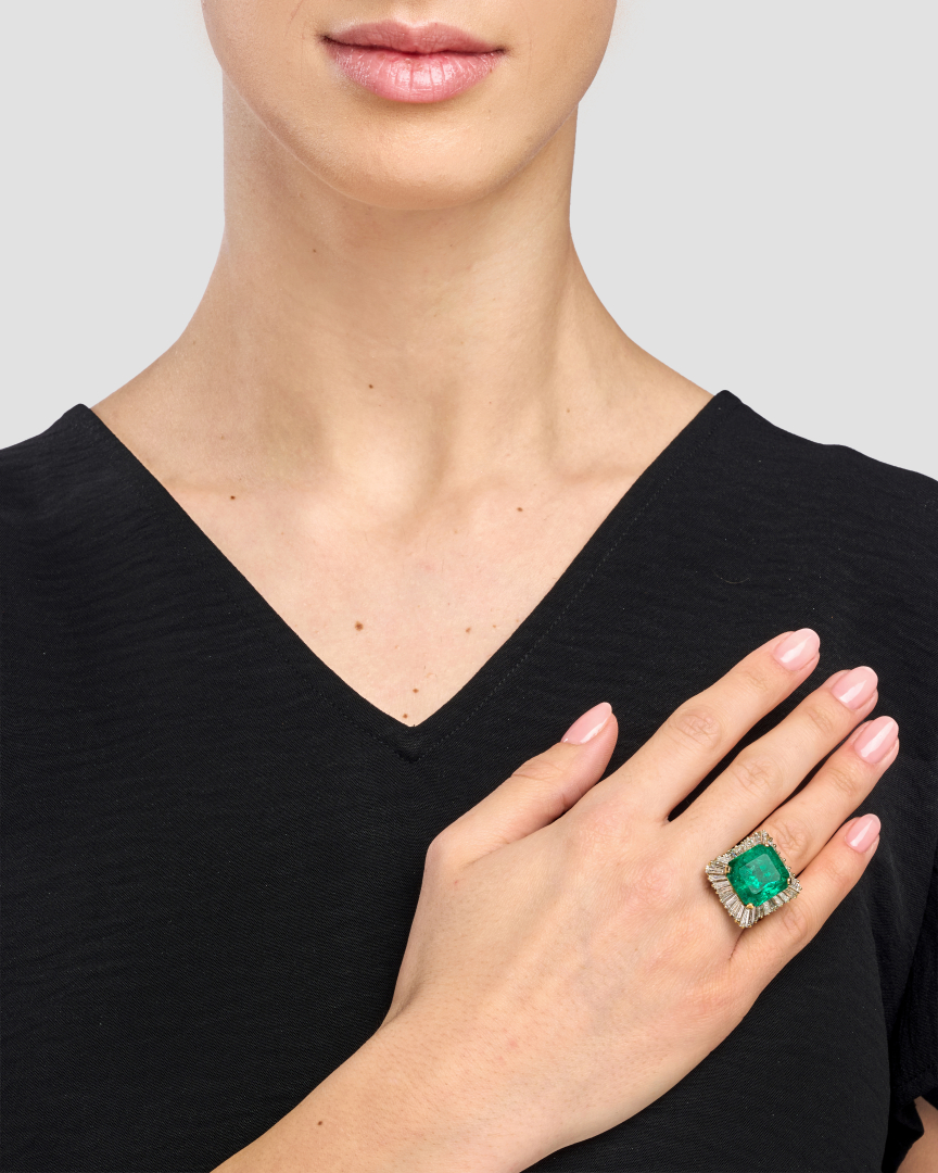 in yellow gold set with an octagonal step-cut emerald weighing approx. 15.00 ct with frame of diamond baguettes weighing approx. 2.00 ct.