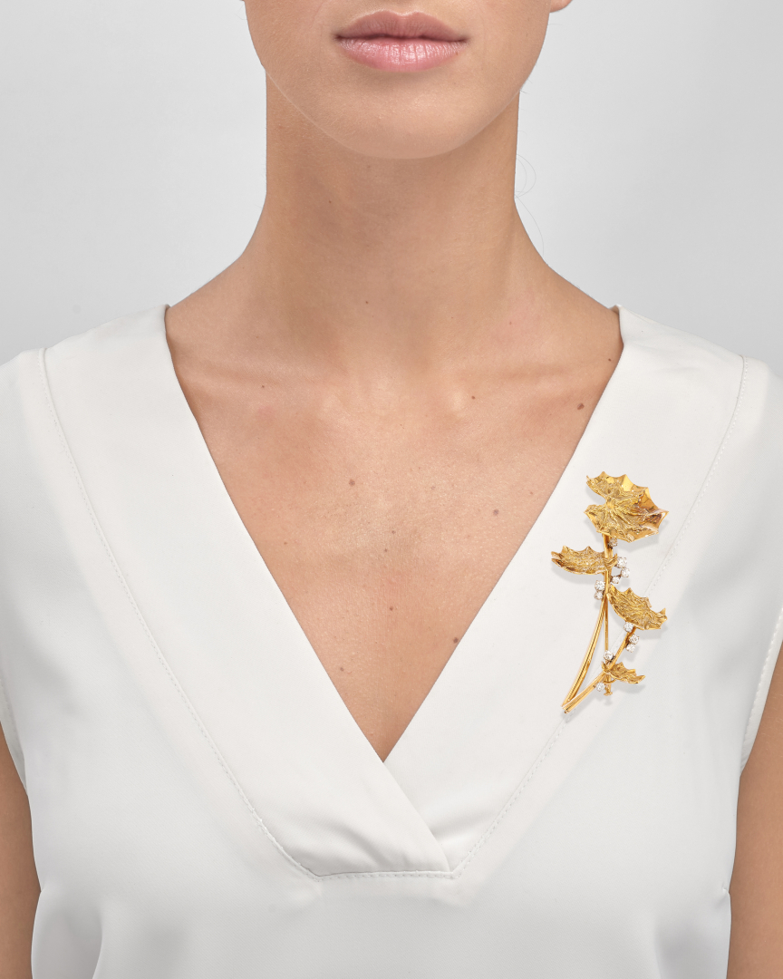designed as a polished and brushed floral spray adorned with eleven round brilliant-cut diamonds weighing approx. 0.85 ct. Signed Fasano. In Fasano, Torino original fitted case.