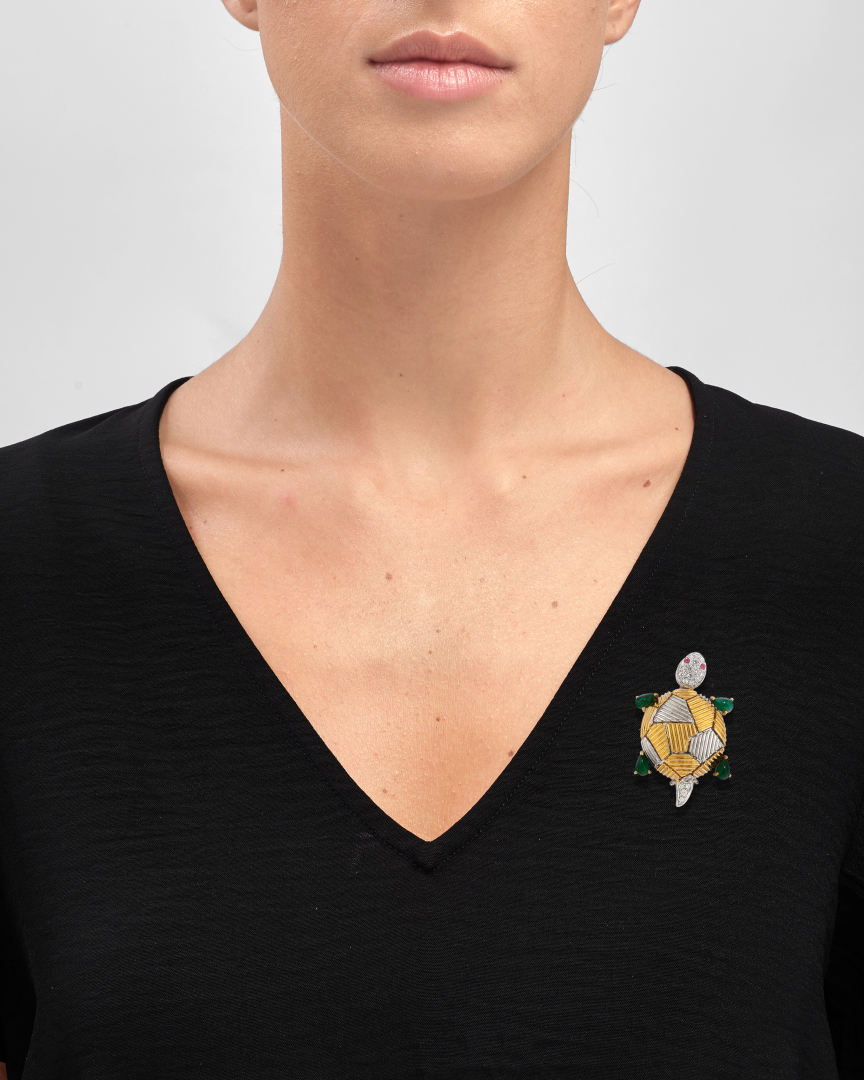 designed as a yellow and white gold turtle with head and tail pavé-set with diamonds, red stone eyes, and emerald-drop feet. Signed Fasano.