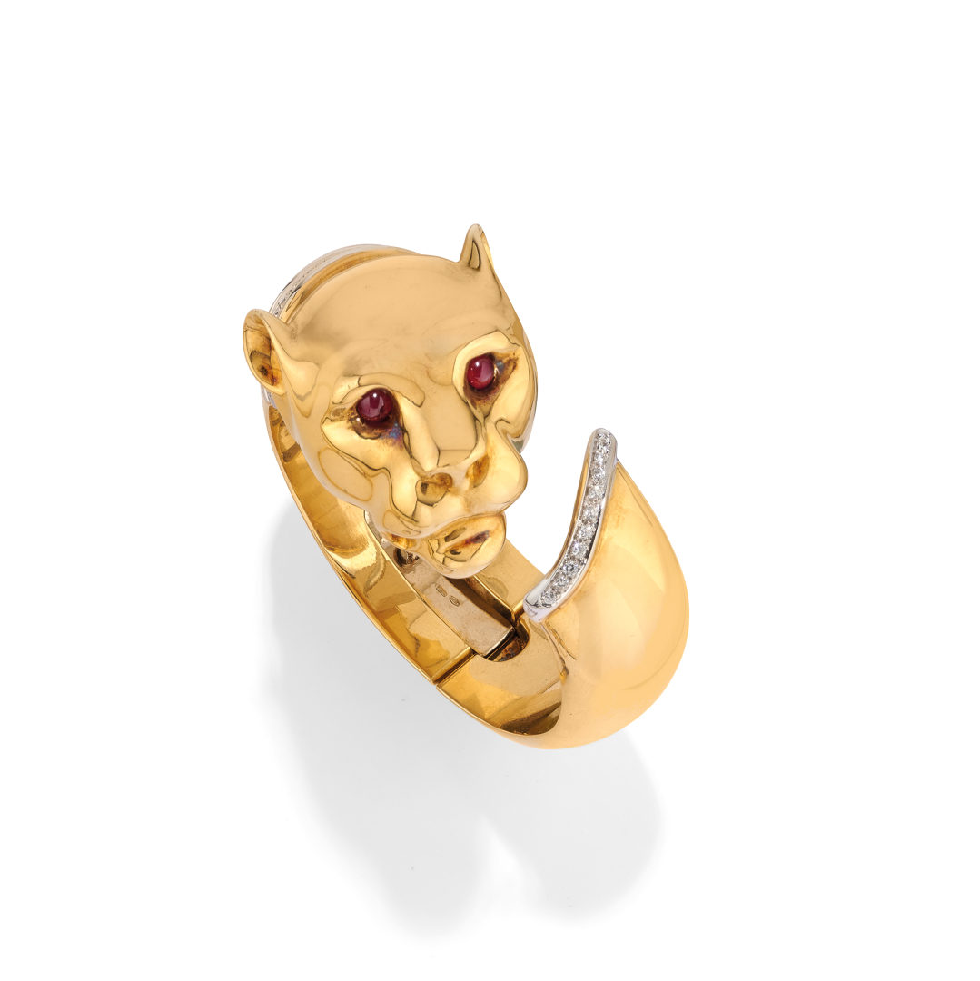 in yellow gold, of rounded design depicting a panther with tail and collar highlighted with pavé-set diamonds, red stone eyes, and easy-open clasp.