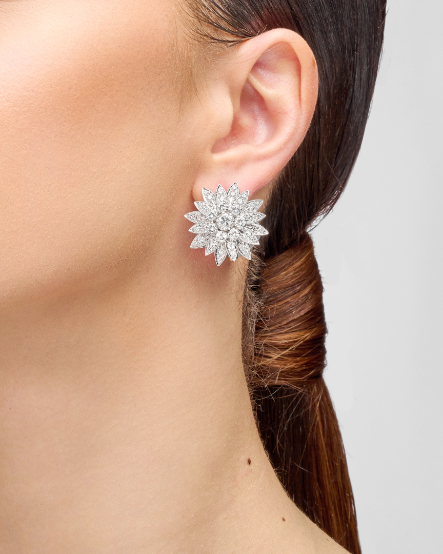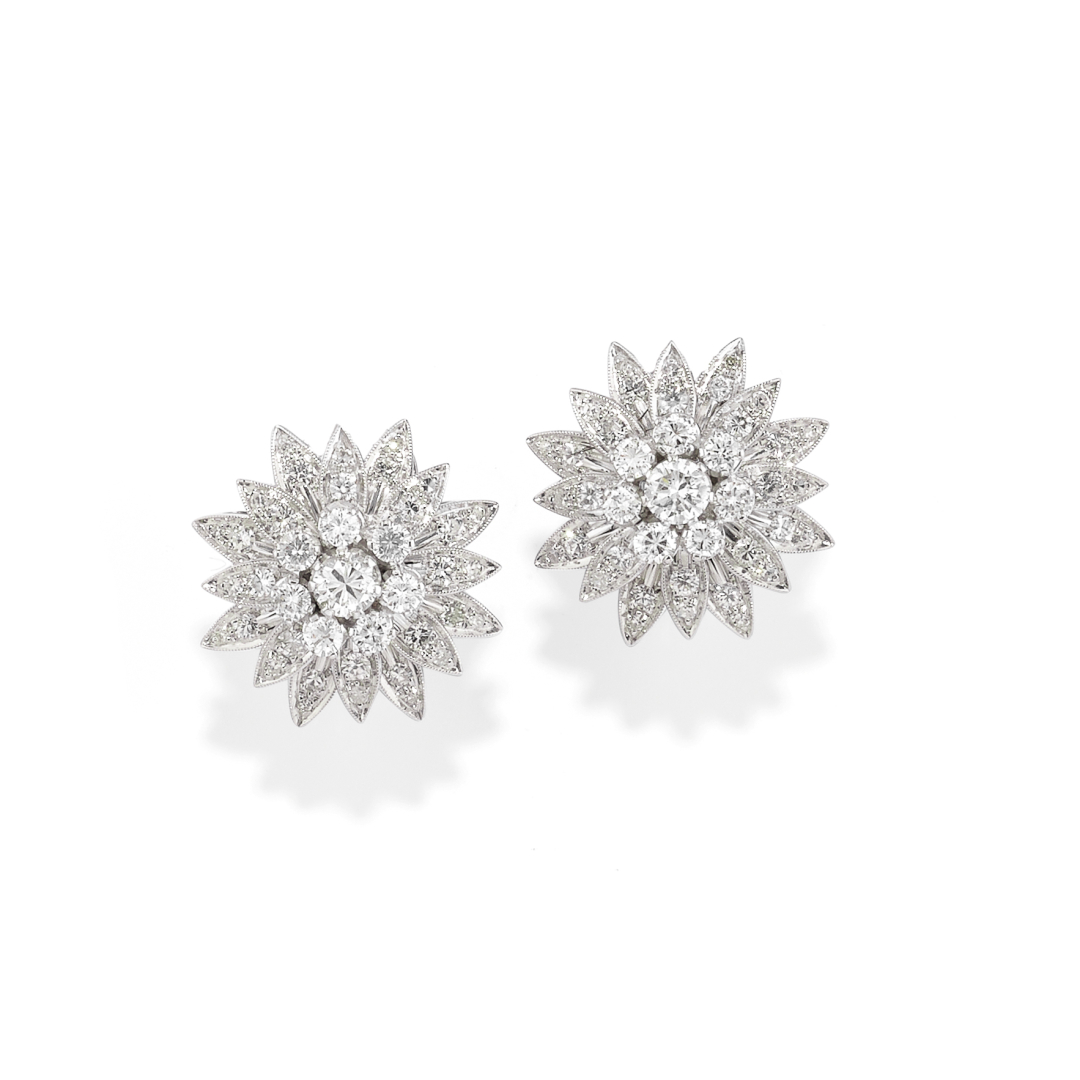 designed as white gold flowers with clip fittings and earring pin, set with round brilliant- and simple-cut diamonds weighing approx. 2.20 ct.