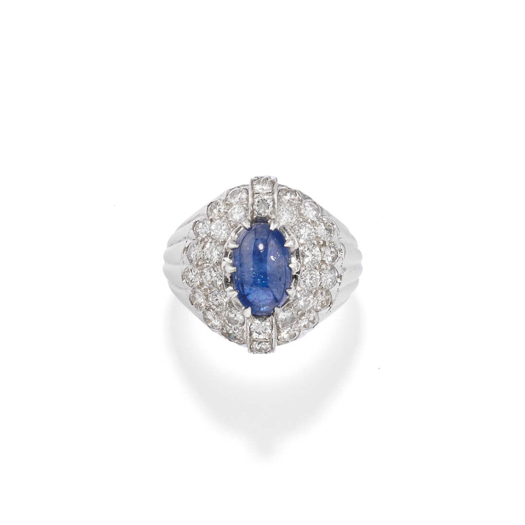 in platinum (French hallmark for platinum) set with round brilliant-cut diamonds weighing approx. 3.00 ct and an elongated oval cabochon sapphire weighing approx. 3.00 ct.