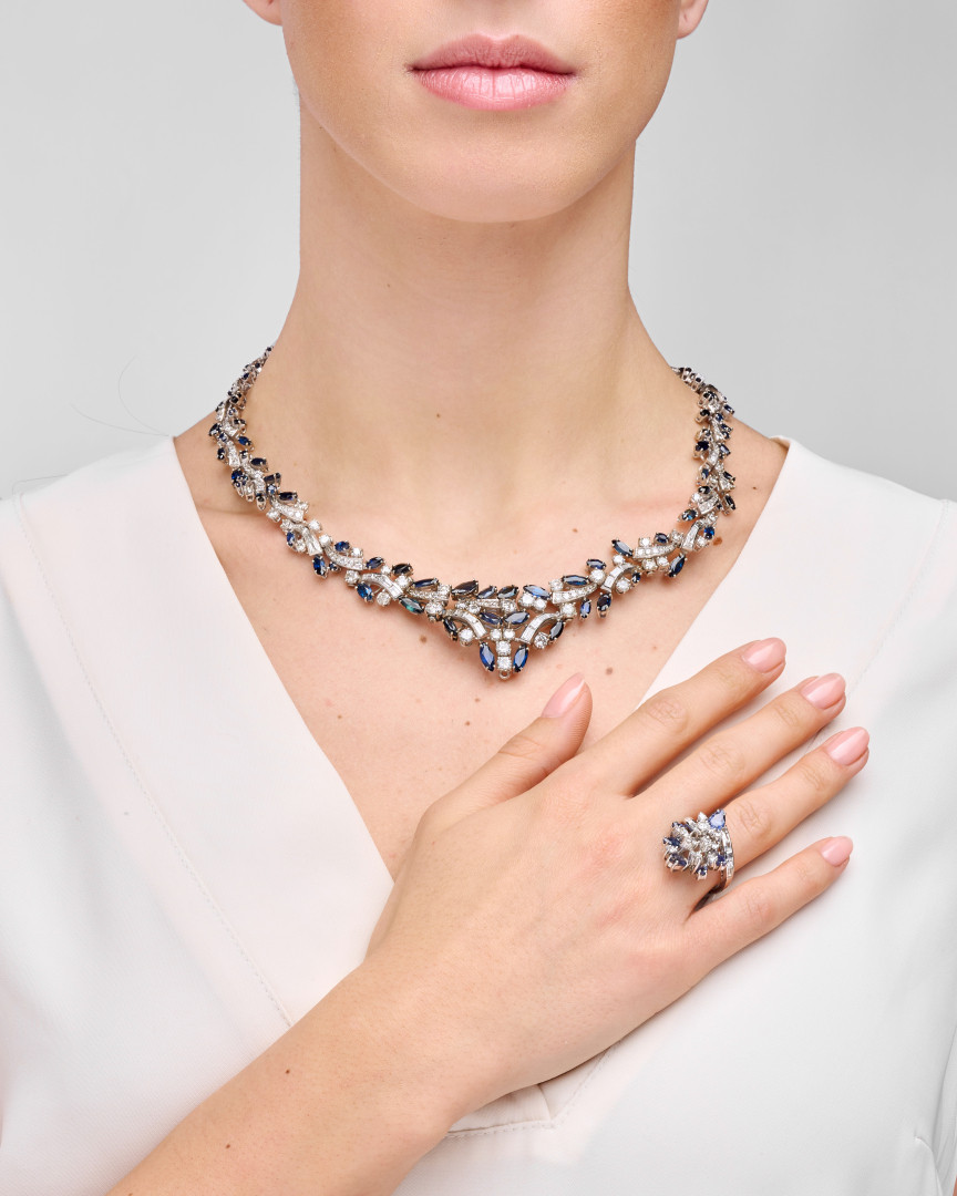 in white gold, the necklace designed as geometric elements with baguette, round brilliant- and simple-cut diamonds weighing approx. 15.00 ct and marquise-cut sapphires and blue stones weighing approx. 15.00 ct. The ring highlighted with baguette and round brilliant-cut diamonds weighing approx. 1.30 ct and pear-cut sapphires weighing approx. 1.50 ct.