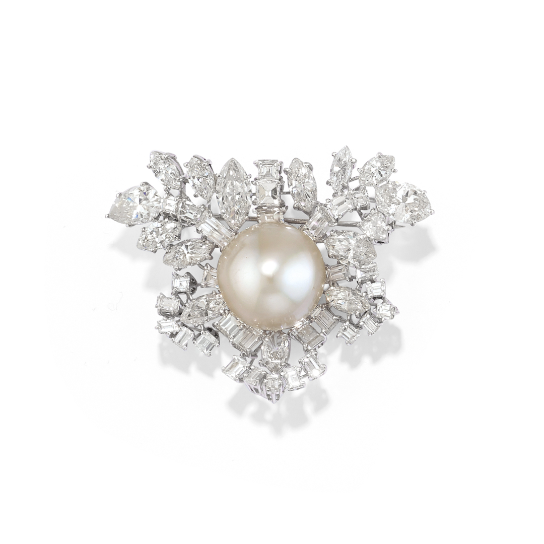 in white gold with a central button pearl and diamonds of various cuts weighing approx. 10.00 ct.
