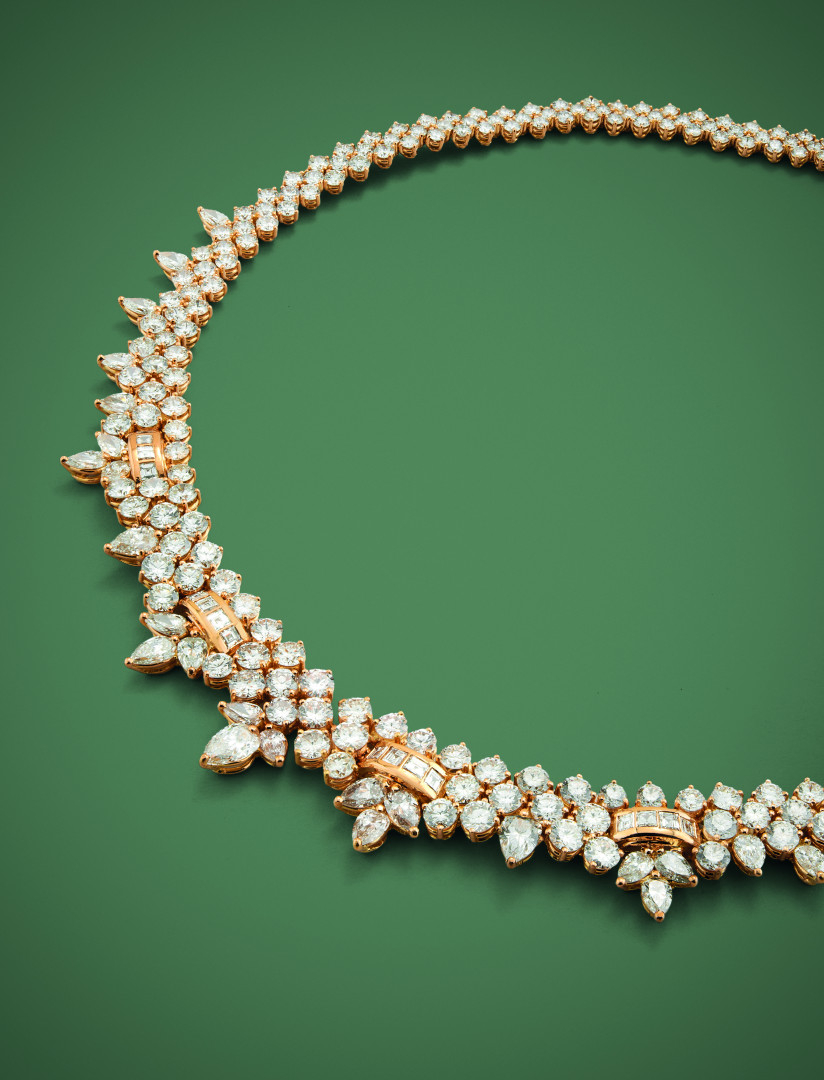 in yellow gold with square-cut diamonds weighing approx. 2.00 ct, pear-cut diamonds weighing approx. 8.00 ct and round brilliant-cut diamonds weighing approx. 33.00 ct.