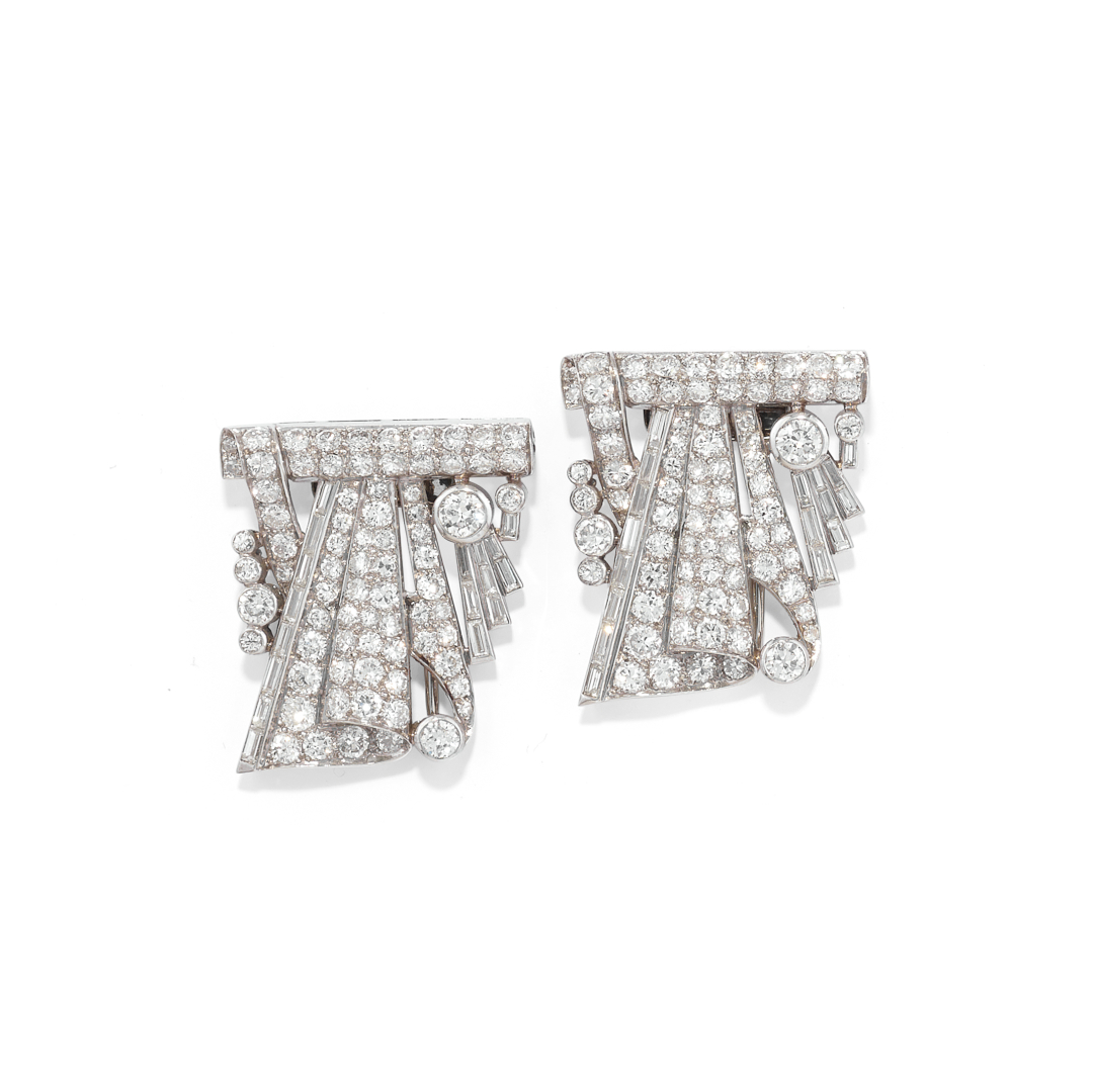 in platinum set with simple-, Old European-cut and baguette diamonds weighing approx. 6.50 ct all together. Of geometric shape, late Deco period. Clip fittings. In Peppino Capuano - Roma original fitted case.
