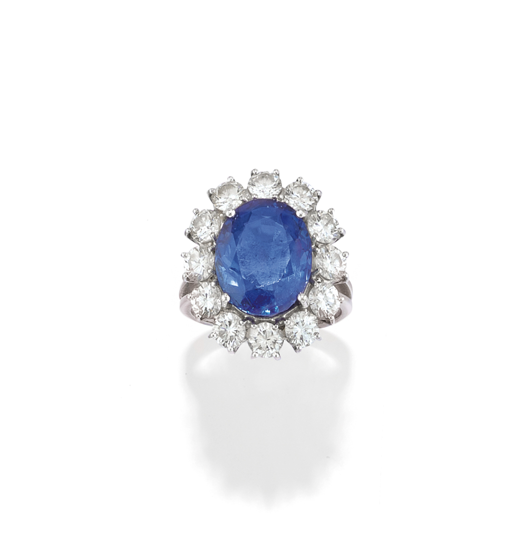 in white gold set with a sapphire weighing approx. 7.50 ct framed by round brilliant-cut diamonds weighing approx. 1.80 ct.