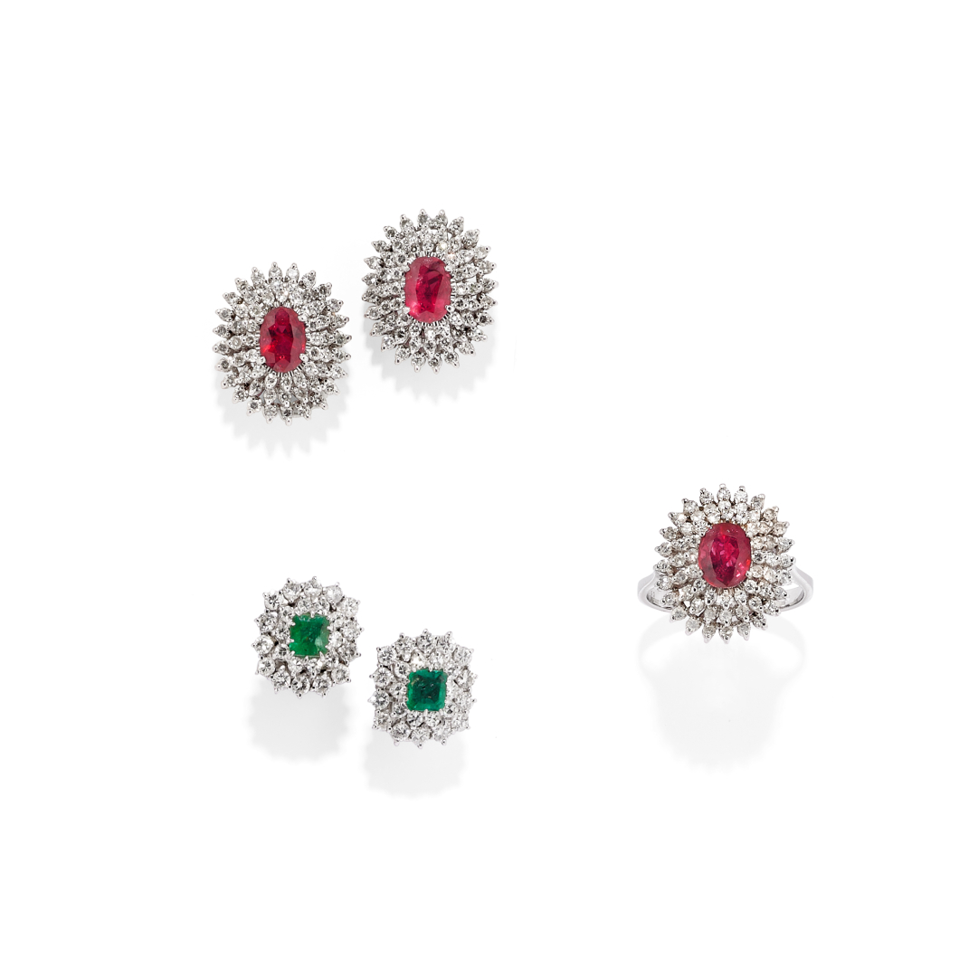 in white gold, the demi-parure including a pair of earrings and ring with oval-cut rubies weighing approx. 2.25 ct and simple-cut diamonds weighing approx. 2.00 ct, and a pair of earrings with frame of round brilliant-cut diamonds centring simple-cut diamonds weighing approx. 1.00 ct and emeralds weighing approx. 1.00 ct.