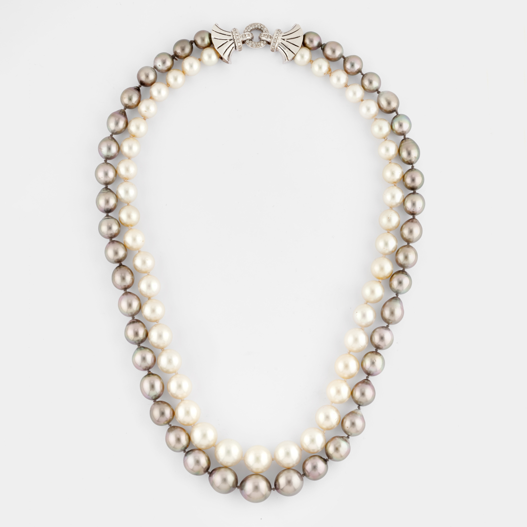 designed as two strands, one of white pearls and one of grey pearls of round and pear shape measuring from approx. 9.00 mm to 14.00 mm with white gold and diamond-set clasp.