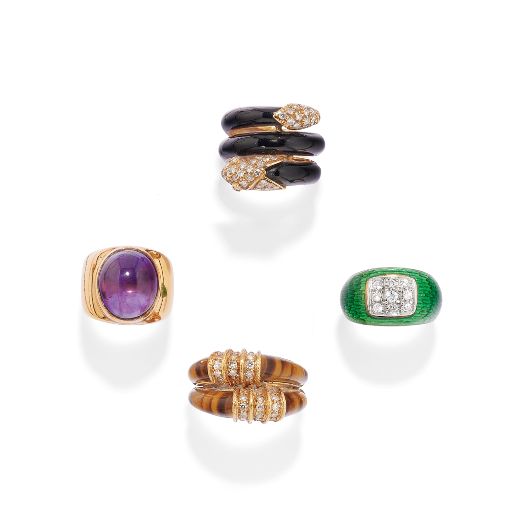 in yellow gold of varying karats, one adorned with tiger's eye and diamonds, one with onyx and diamonds, one with green enamel and diamonds, and one with a purple stone.