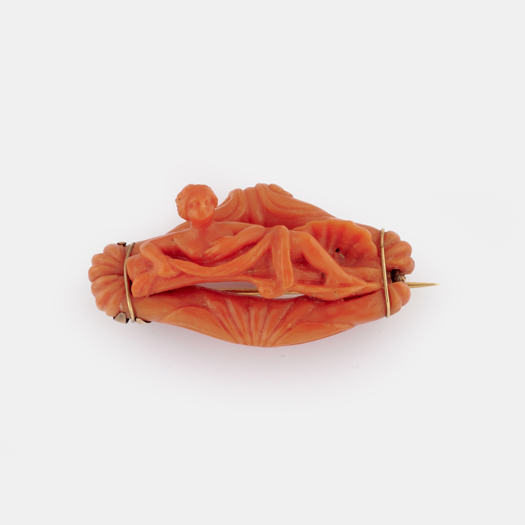 in Mediterranean coral and gilded metal depicting a female figure. Italy, late XIX century.