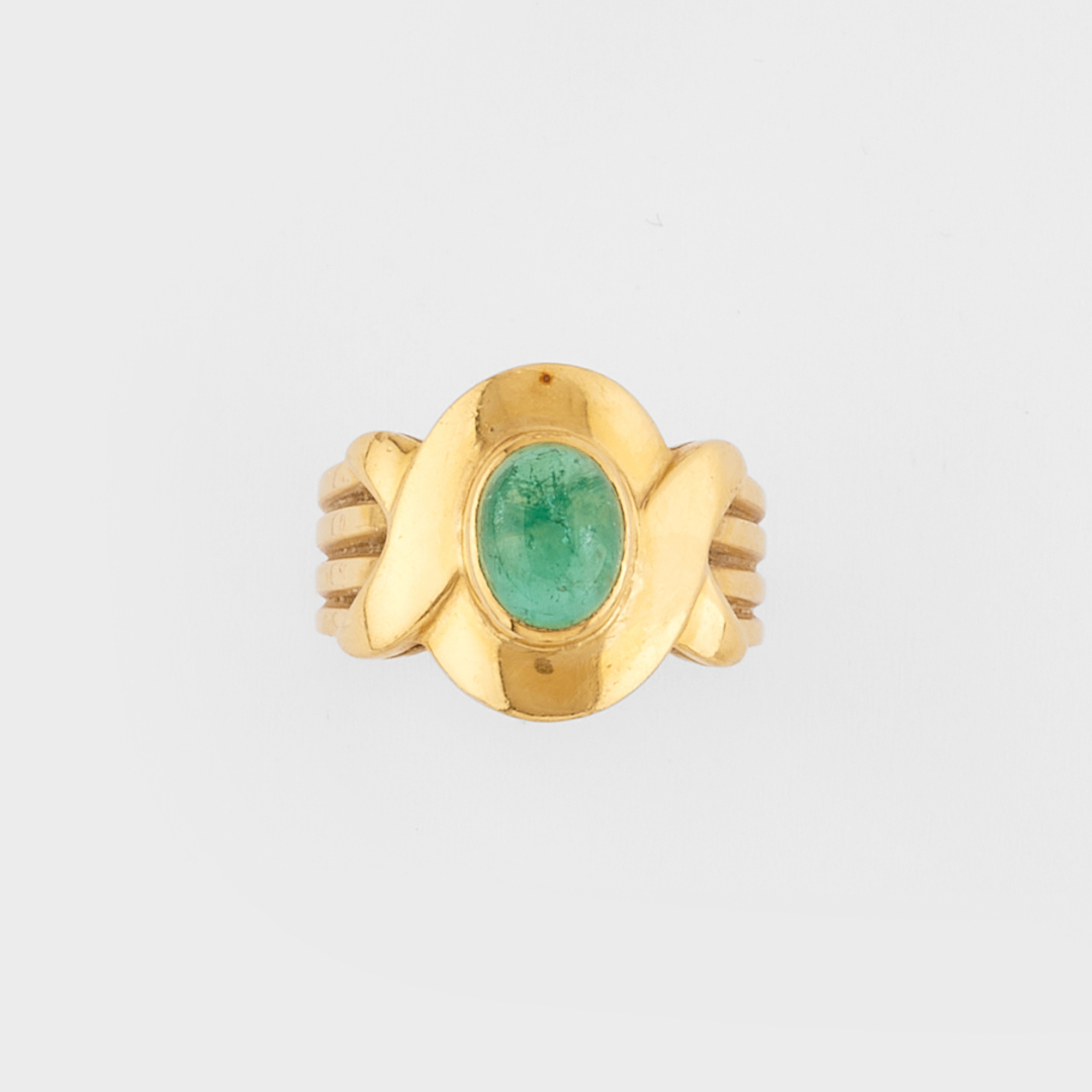 designed as a yellow gold shank with four-band decoration holding an emerald.