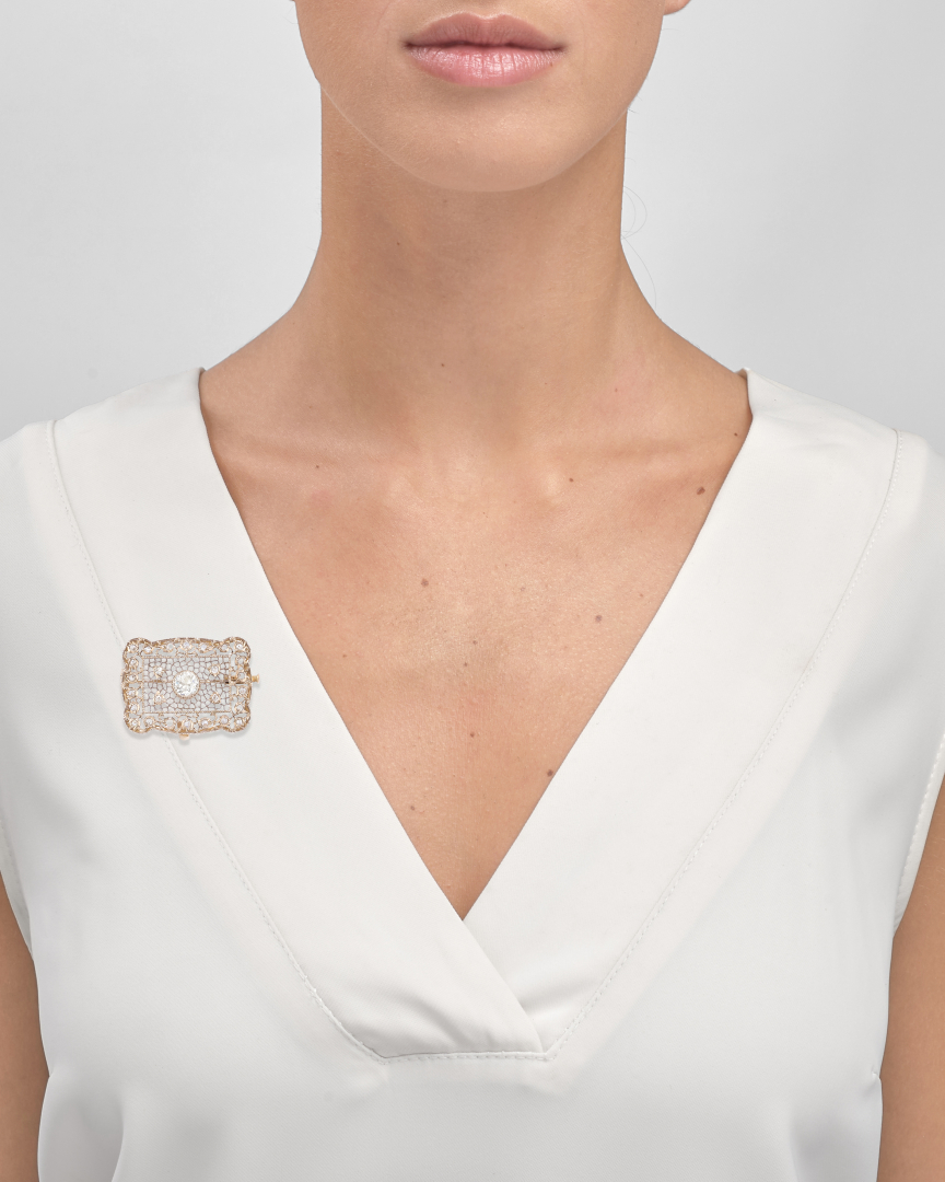 in silver and 9K yellow gold of rectangular shape with a lacework pattern highlighted with rose-cut diamonds and a central Old Mine-cut diamond weighing approx. 0.85 ct. One small diamond deficient.