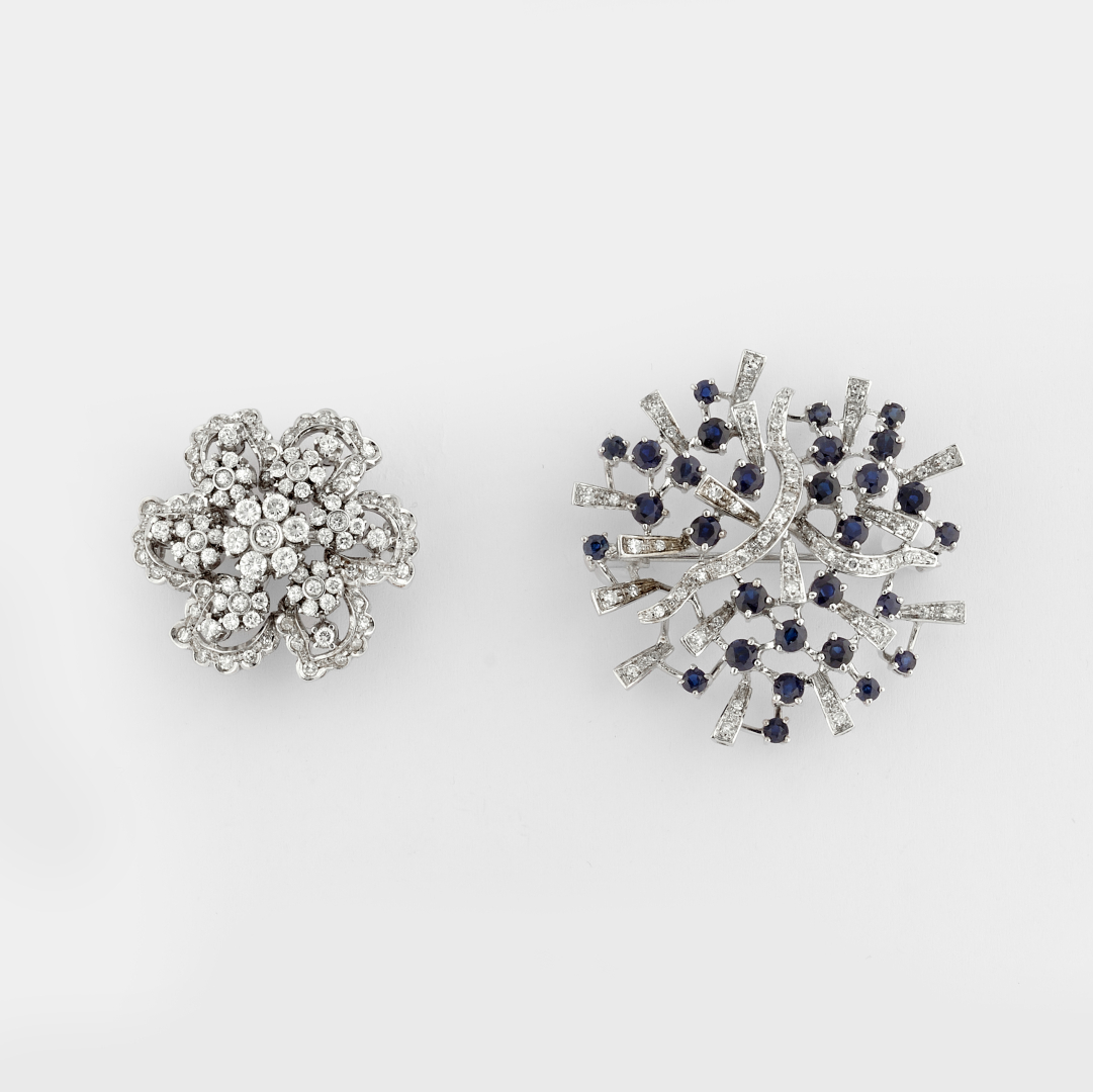 in white gold, one with sapphires and blue stones weighing approx. 2.50 ct and simple-cut diamonds weighing approx. 0.50 ct, and the other of flower design with "en tremblant" elements and diamonds weighing approx. 1.80 ct.