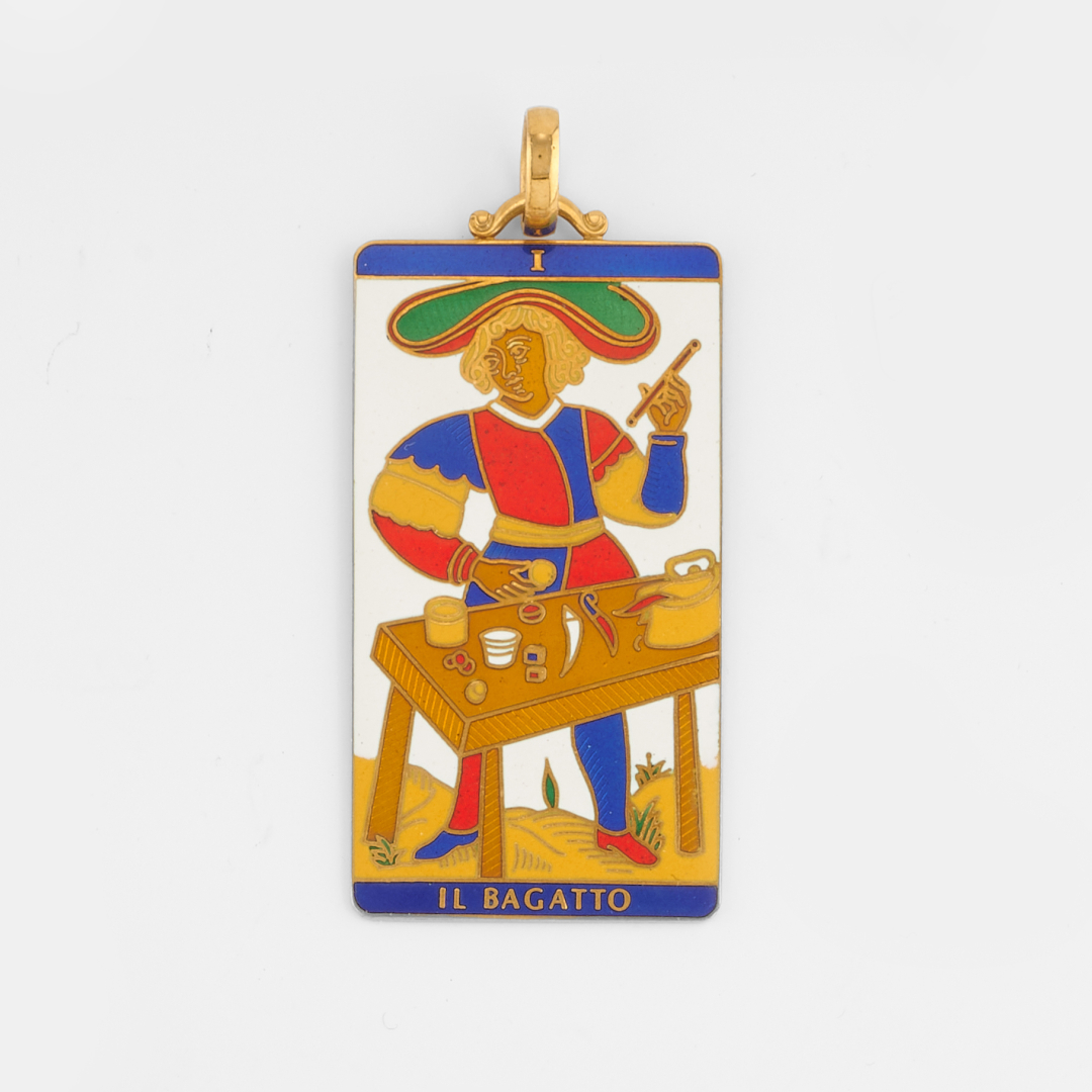 in yellow gold, of rectangular shape with undulated motif on the reverse, depicting "Il Bagatto" (The Musician).