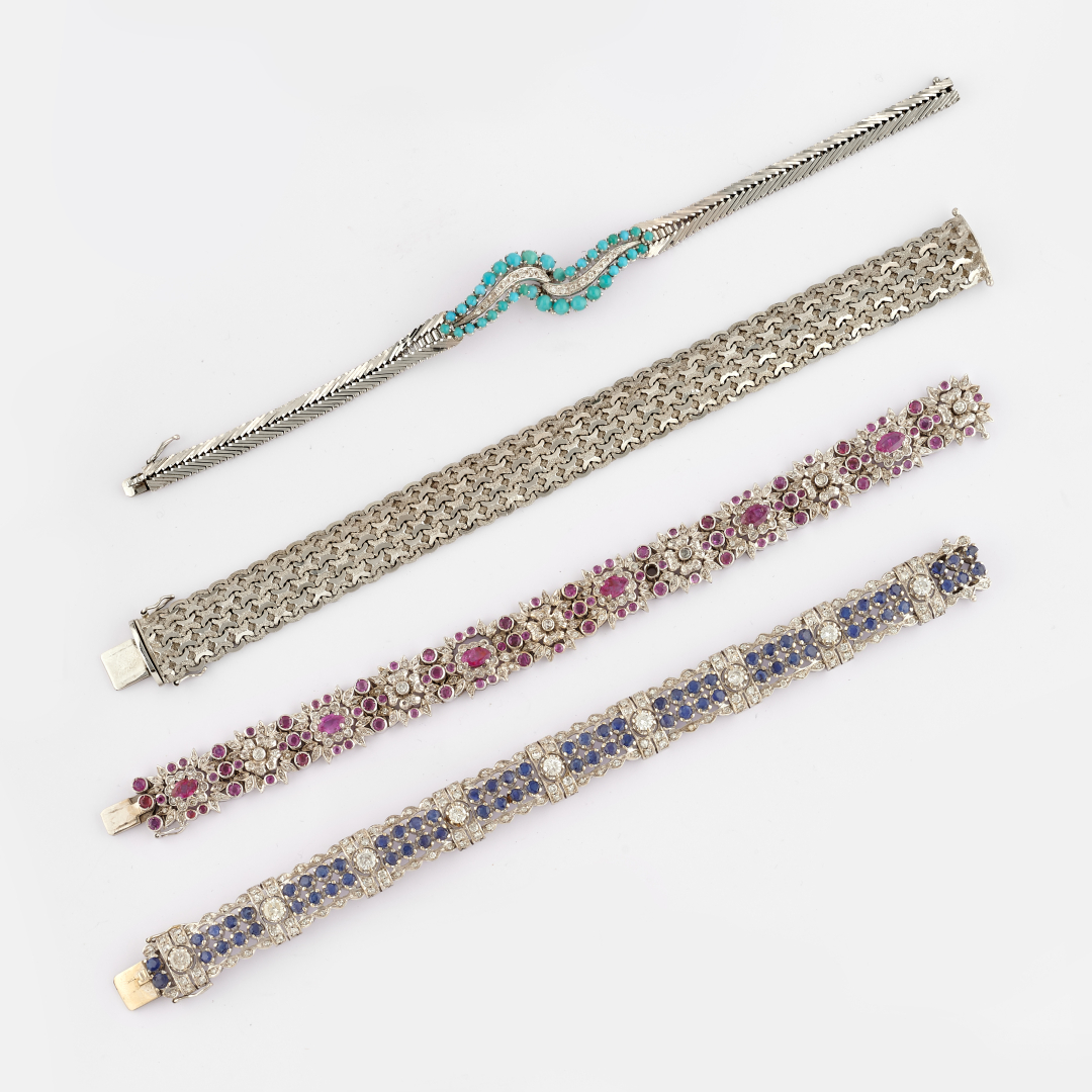 in white gold of varying karats, one designed as interwoven geometrics motifs, one of herringbone design with turquoises and diamonds, one with floral elements in diamonds and rubies (one ruby deficient), and one of linear design with sapphires and diamonds.