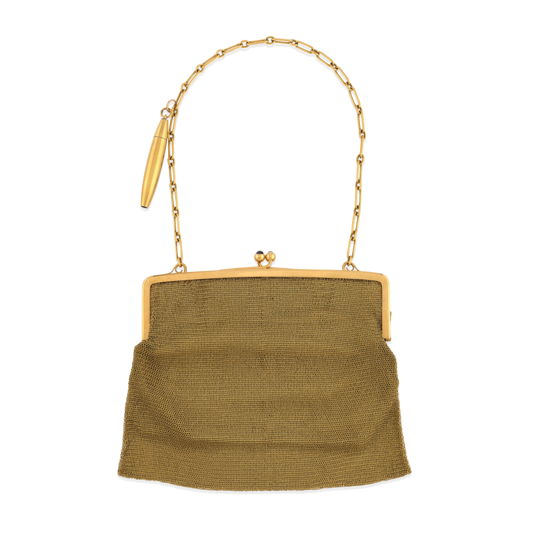 designed as a mesh bag with chain handle adorned with a pen and closure adorned with two settings holding blue stones. Pen not in working condition.