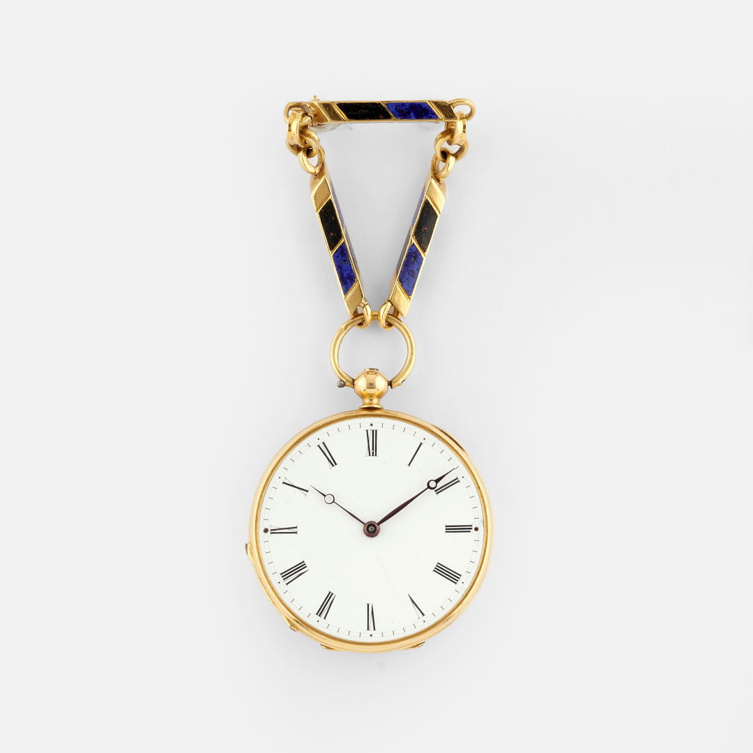 in yellow gold with elements inlaid with lapis lazuli and bloodstone. The case is adorned with inlaid lapis lazuli in the shape of a flower and centre set with a diamond weighing approx. 0.30 ct. Not running at the time of cataloguing.