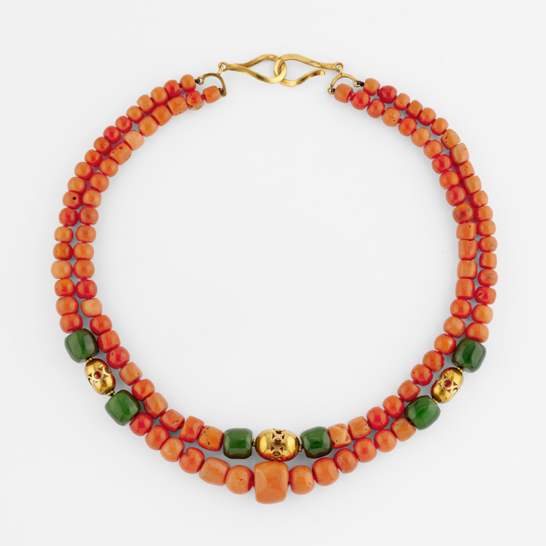 designed as two graduated strands with yellow gold and jadeite elements and a yellow gold lobster clasp.