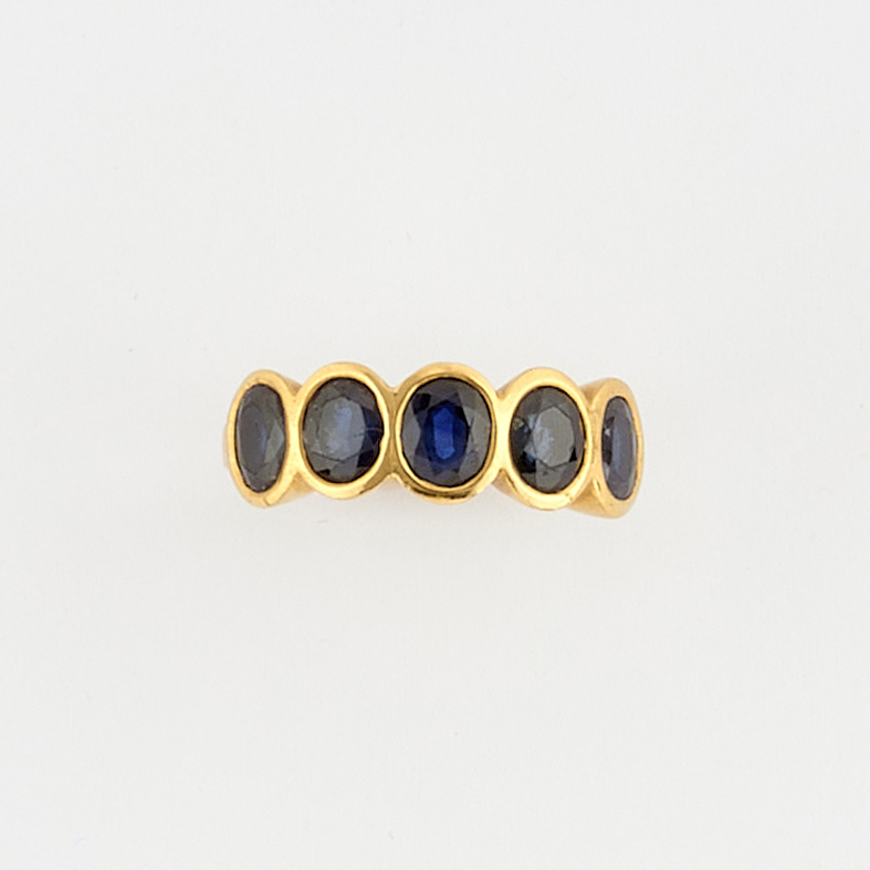 in yellow gold set with five oval-cut sapphires.