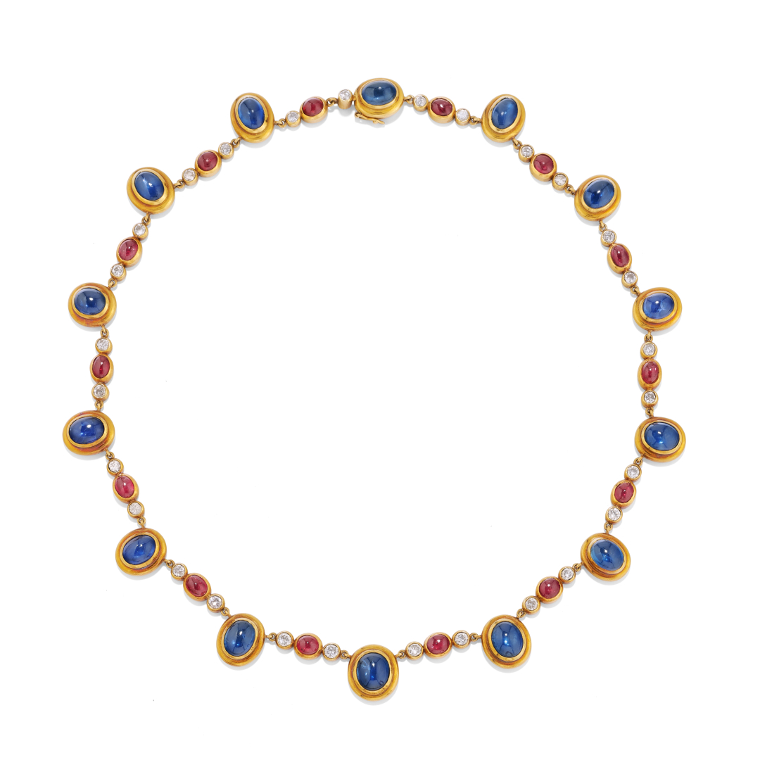 in yellow gold with sapphires weighing approx. 20.00 ct, rubies weighing approx. 7.00 ct and circular-cut diamonds weighing approx. 2.50 ct. Circa 1950.