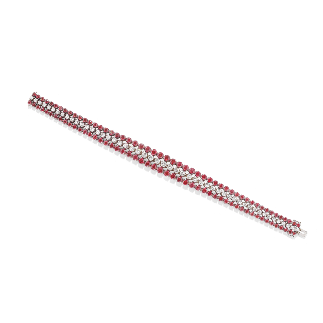 designed as a white gold rivière set with round brilliant-cut diamonds weighing approx. 4.00 ct flanked by two rows of round brilliant-cut rubies weighing approx. 9.00 ct. Circa 1935/1950.