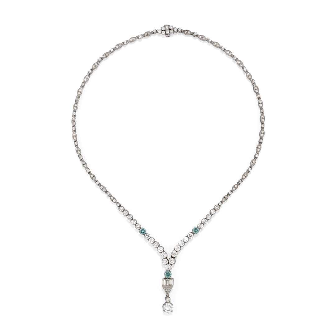 designed as platinum oval links holding at the center a rivière of brilliant-cut diamonds, three of which are treated blue, and a pendant in baguette and triangle-cut diamonds suspending a brilliant-cut diamond weighing approx. 1.00 ct. Total estimated weight of diamonds 10.00 ct. Circa 1960.