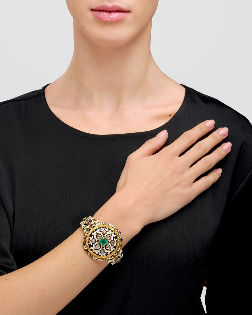 ANTICO BRACCIALE IN SMALTI, DIAMANTI E SMERALDO