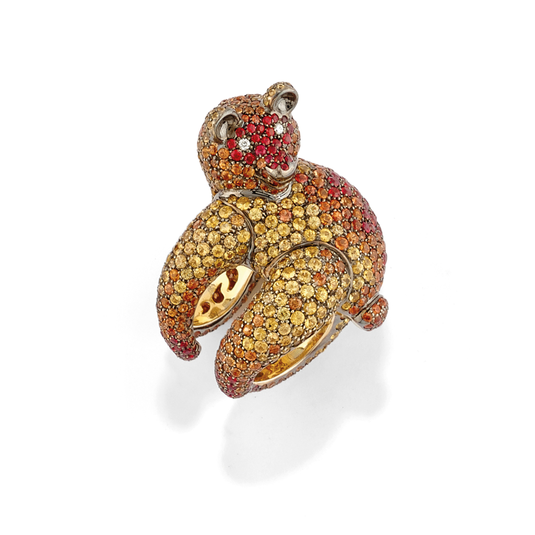 in white and yellow gold depicting a panda in yellow, champagne and pink sapphires weighing approx. 24.00 ct and eyes set with diamonds weighing approx. 0.04 ct.