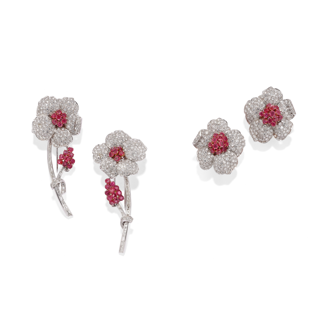 in white and yellow gold, including two long flower brooches with clip fittings pavé-set with diamond baguettes and circular-cut rubies, a pair of ear clips pavé-set with circular-cut diamonds and rubies. Total estimated weight of diamonds 6.00 ct; total estimated weight of rubies 5.00 ct. Three diamonds deficient. In Peppino Capuano - Roma original fitted case.
