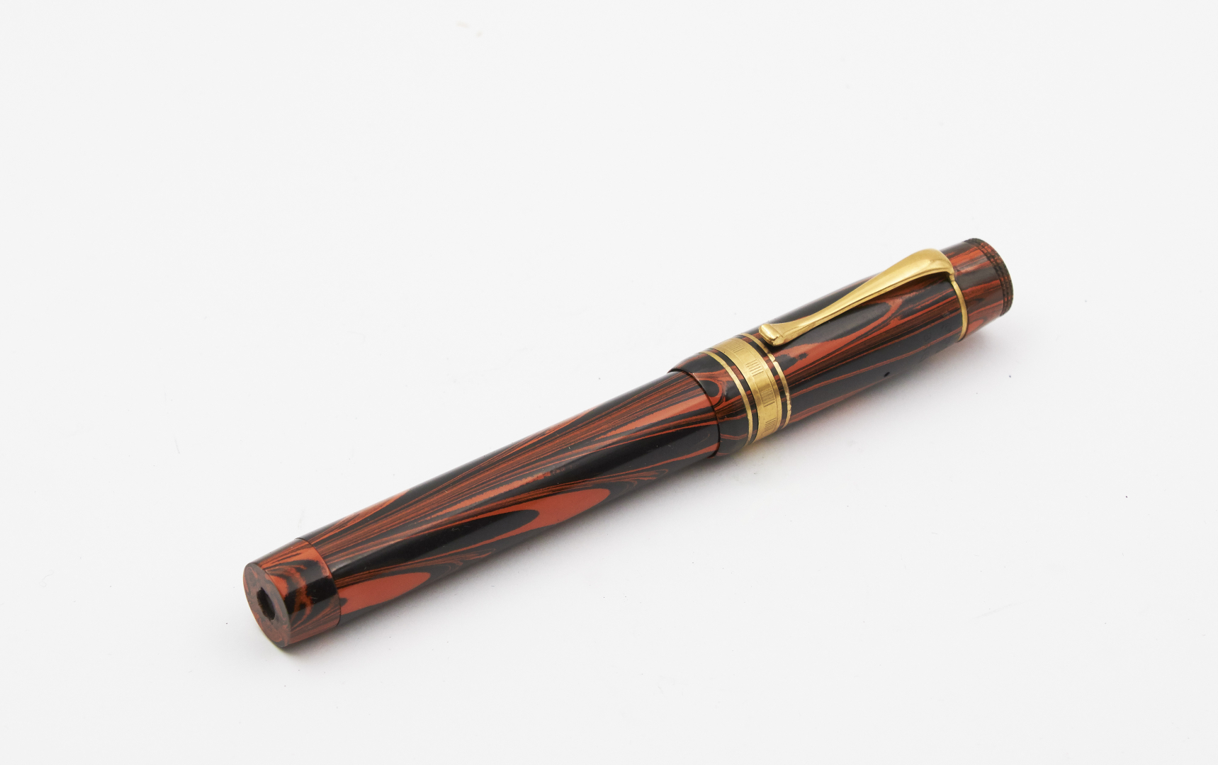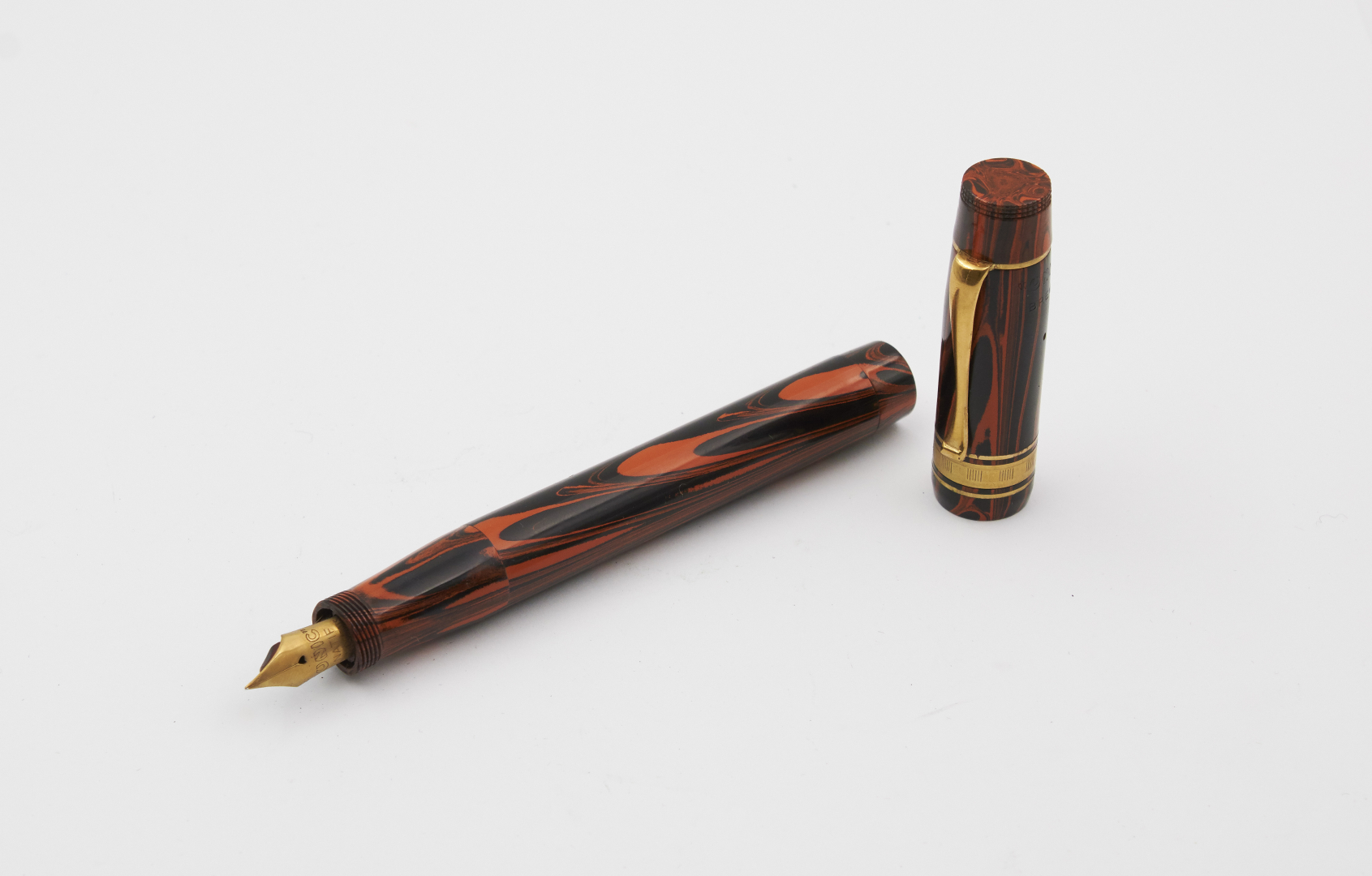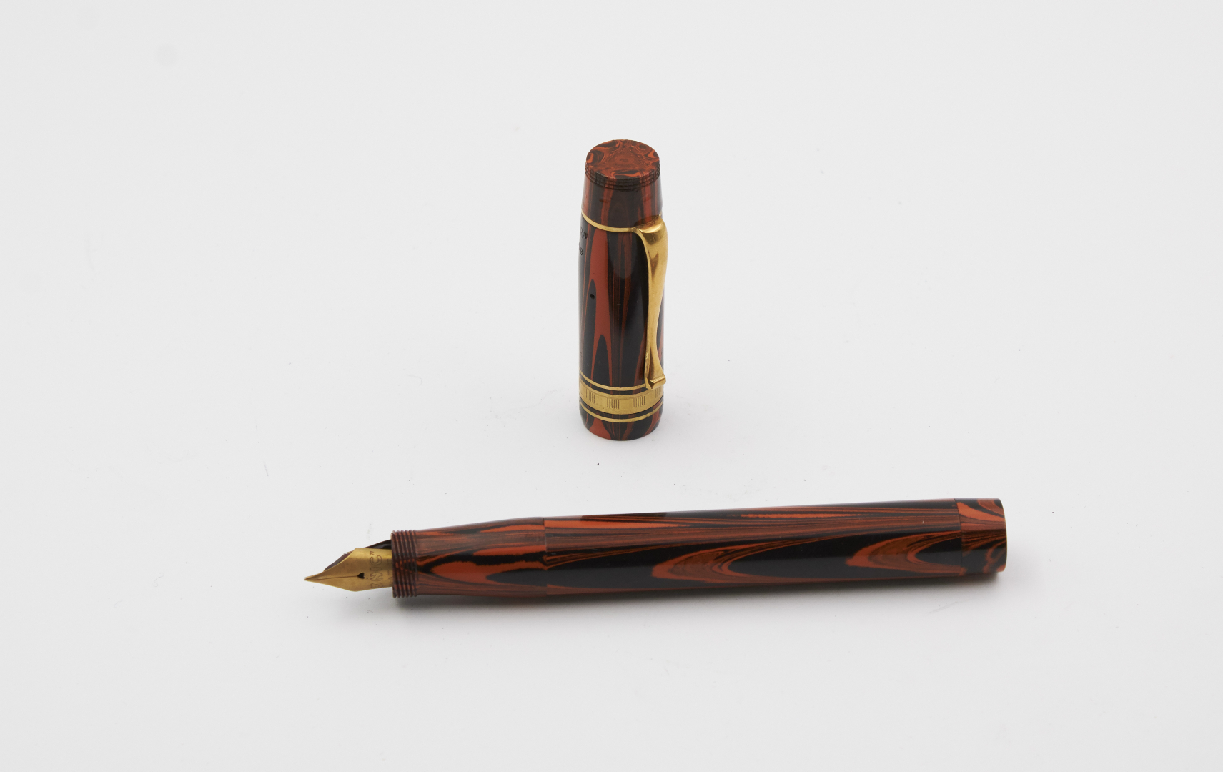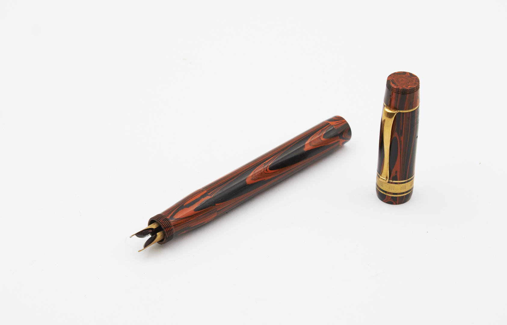 Signed 18K gold nibs, size F, double retractable nib, UNIC Duocolor Zerollo Brevet No. 728038, ripple red flamed ebonite.