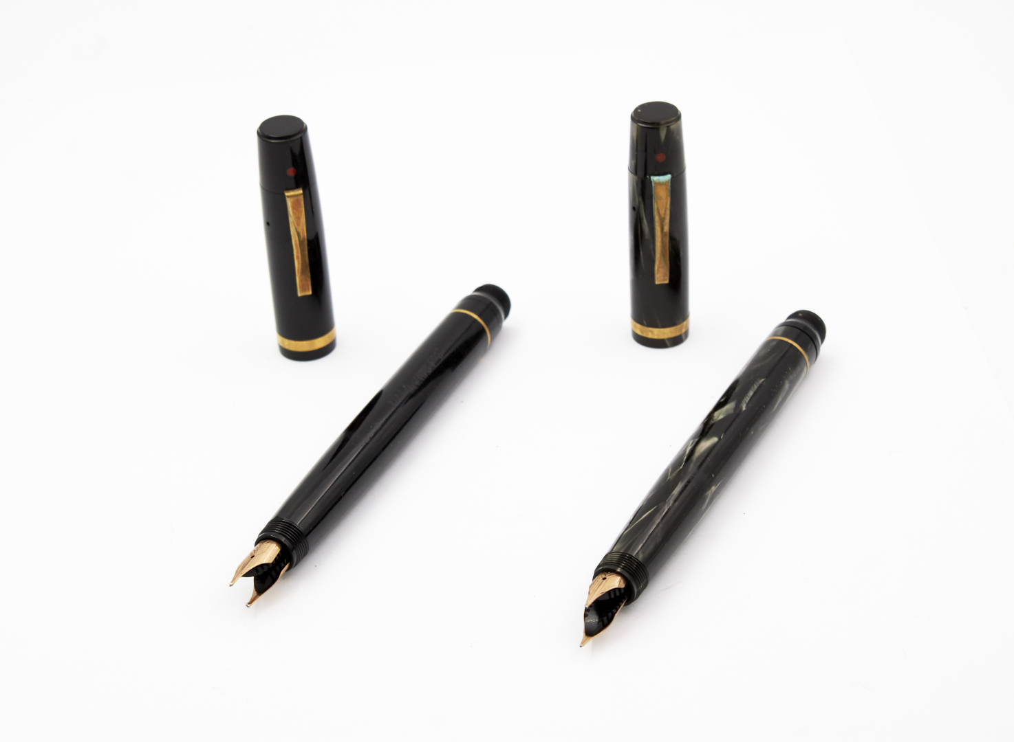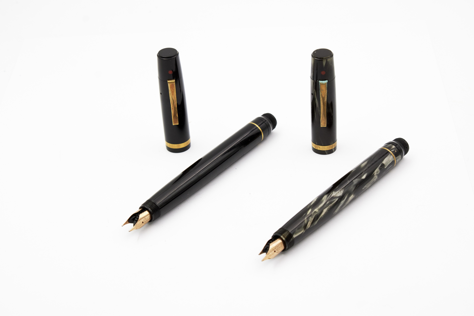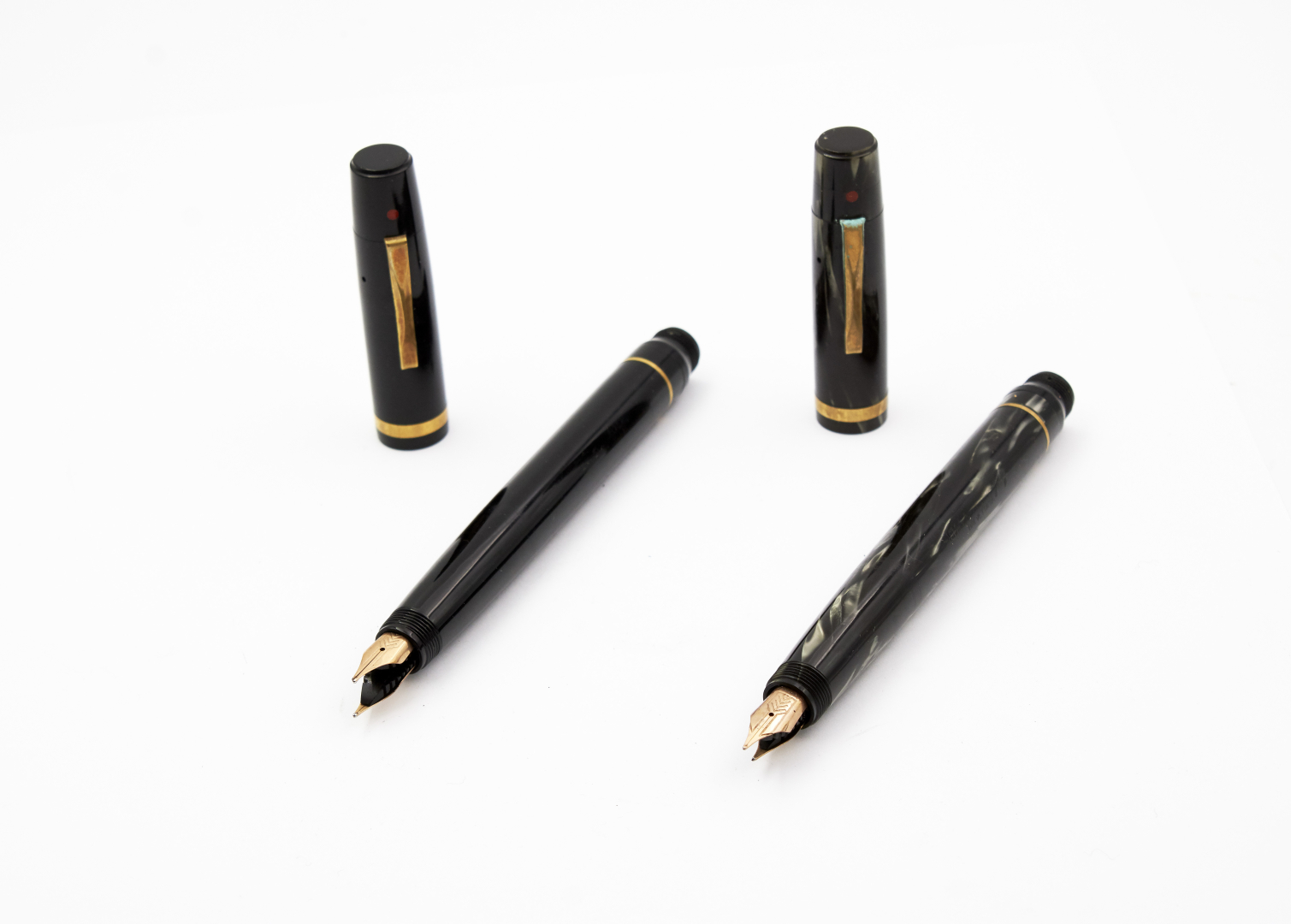 Signed Omas gold nibs, presumably M size, double retractable nib, in black and mottled grey celluloid.