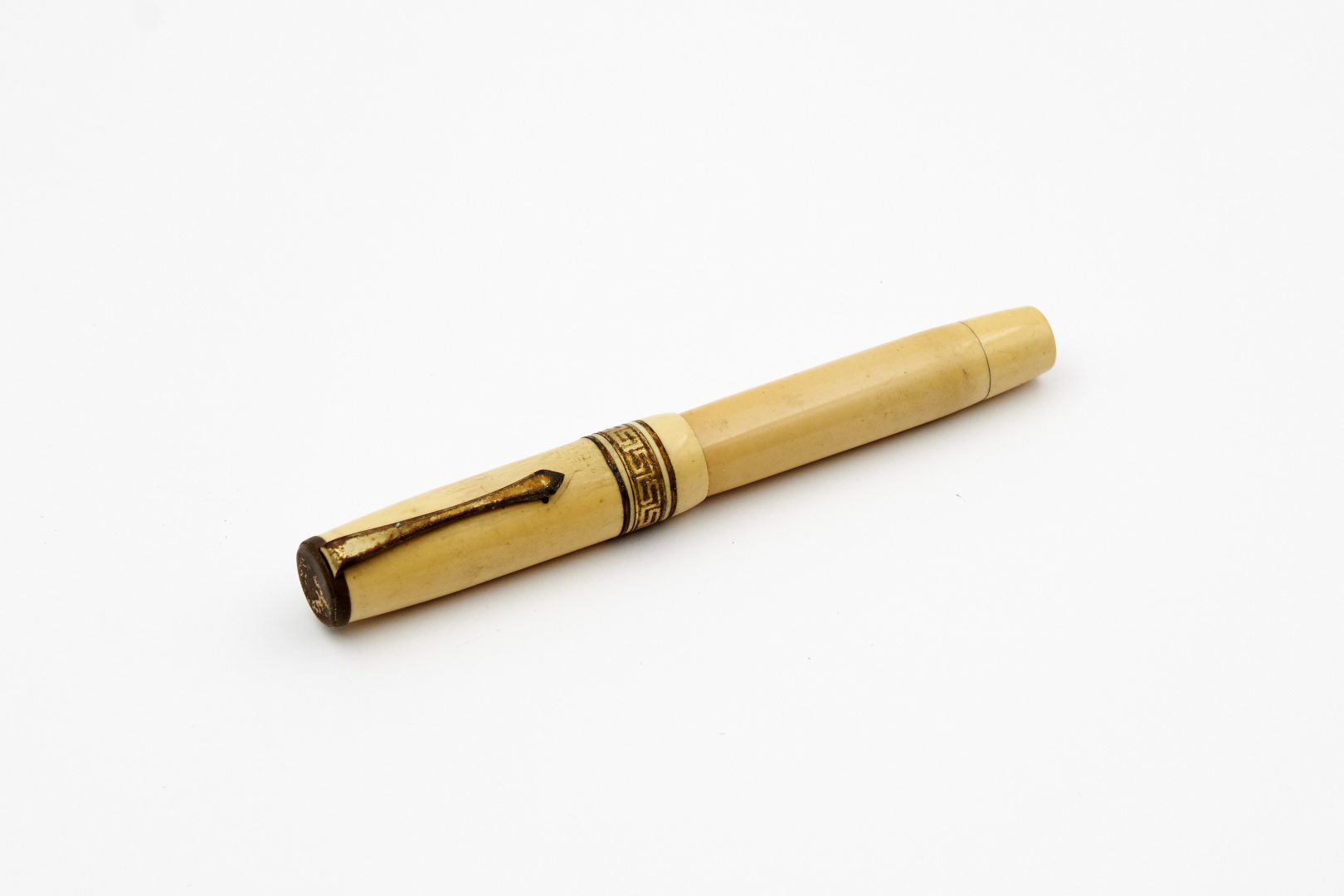 14K Gold and stamped New York nib, ivory-white ebonite, cap engraved with an eagle emblem and "Ethiopia" written underneath, band decorated with a Greek fret, eyedropper filling, screw end cone to store ink tablets.