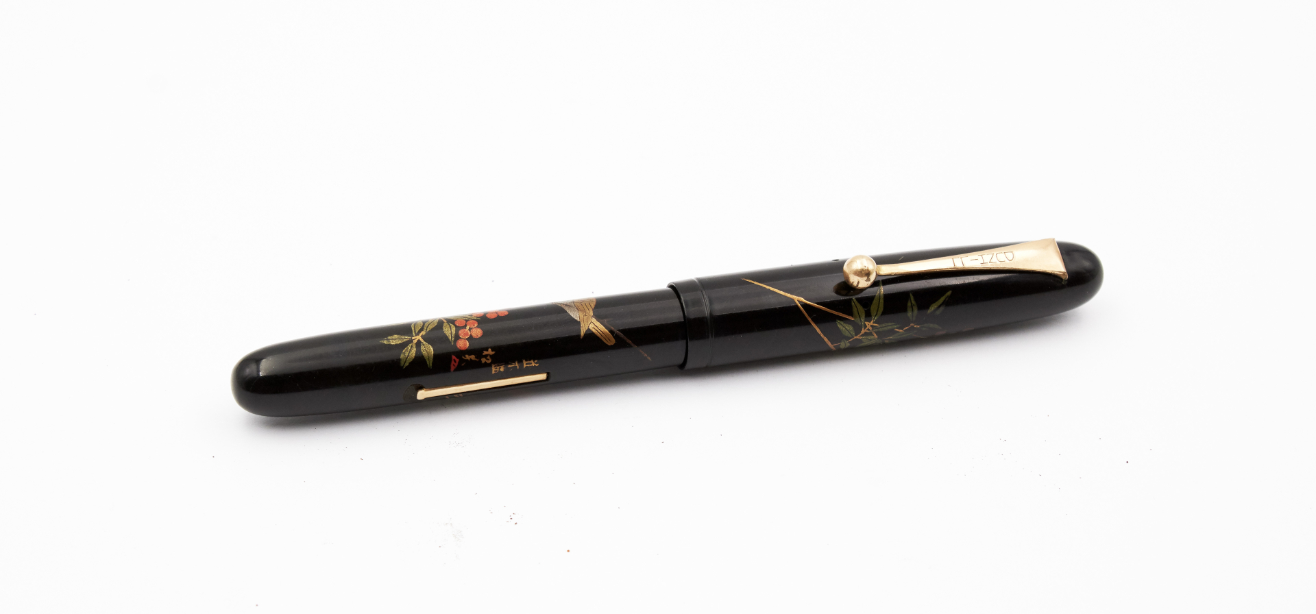 14K gold nib signed Dunhill Namiki, n. 3, presumably M size, lever filler, lacquered body decorated in maki-e technique with a bird motif, artist’s signature, clip signed Dunhill.