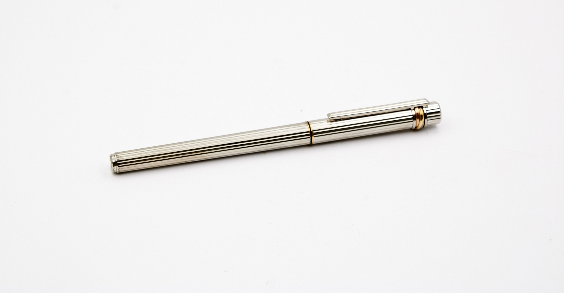 N. B22373, 18K gold nib, size F, converter filling, gold-plated and knurled steel body, three-colour gold ring.