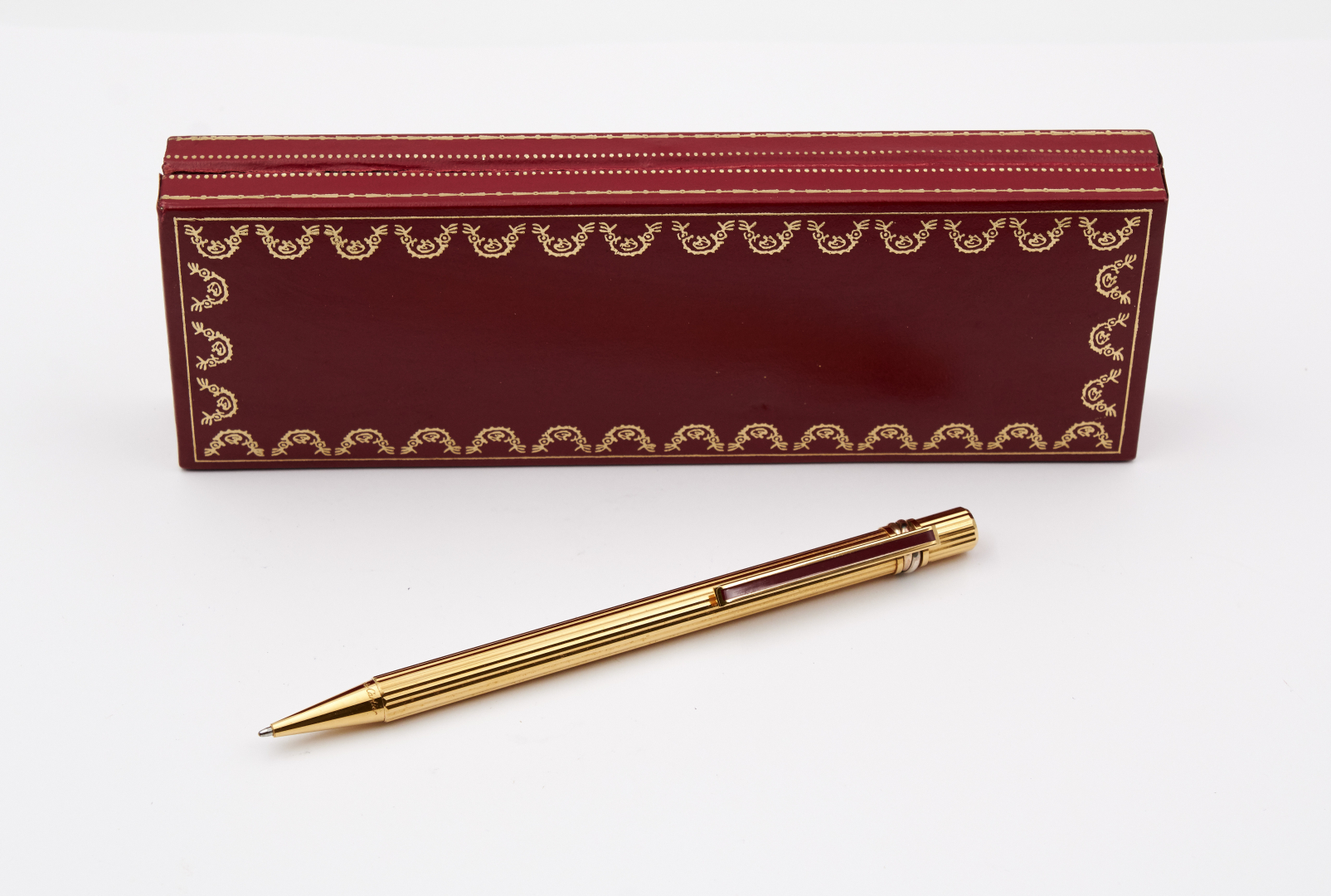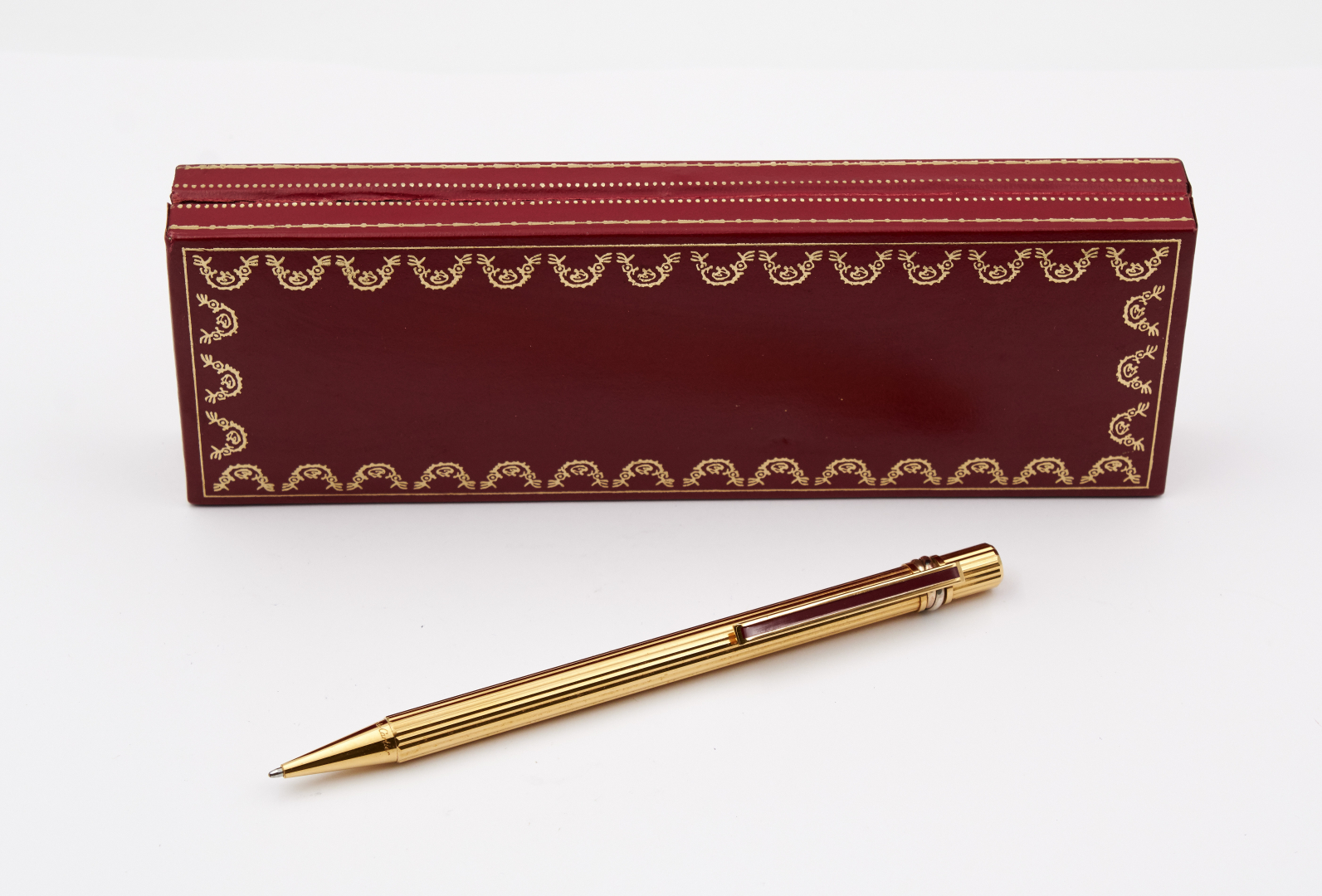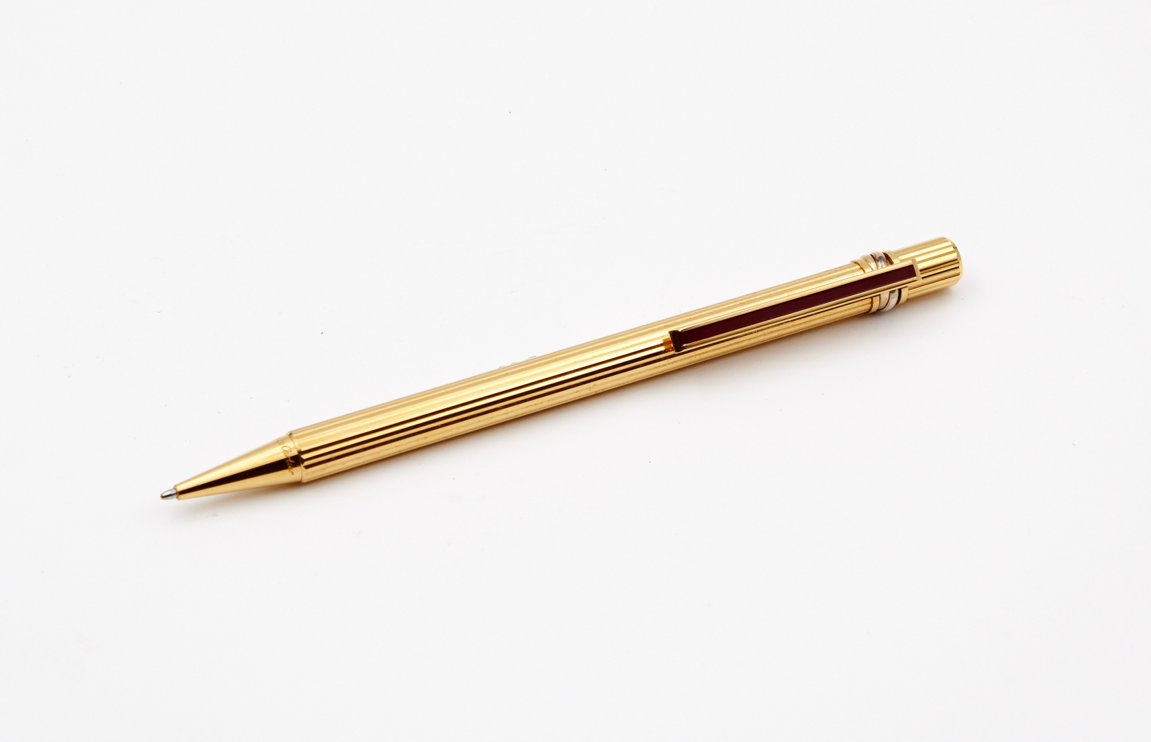 N. 503342, gold-plated and knurled, red lacquer clip, three-tone gold ring.