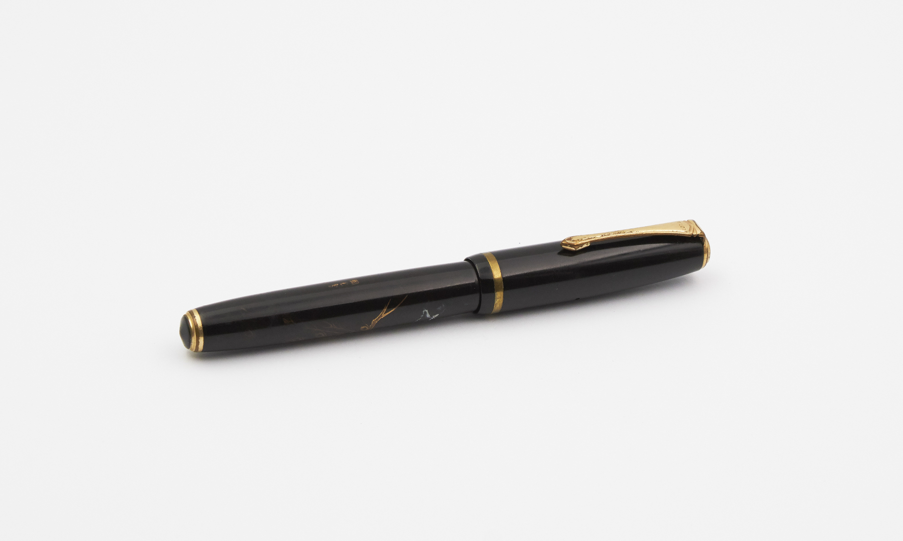 Signed 14K gold nib, n. 3, eyedropper filler, maki-e decoration depicting a peacock, artist's signature.