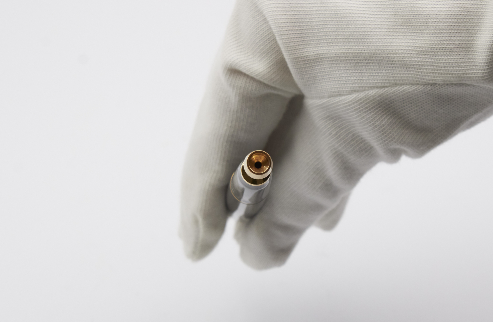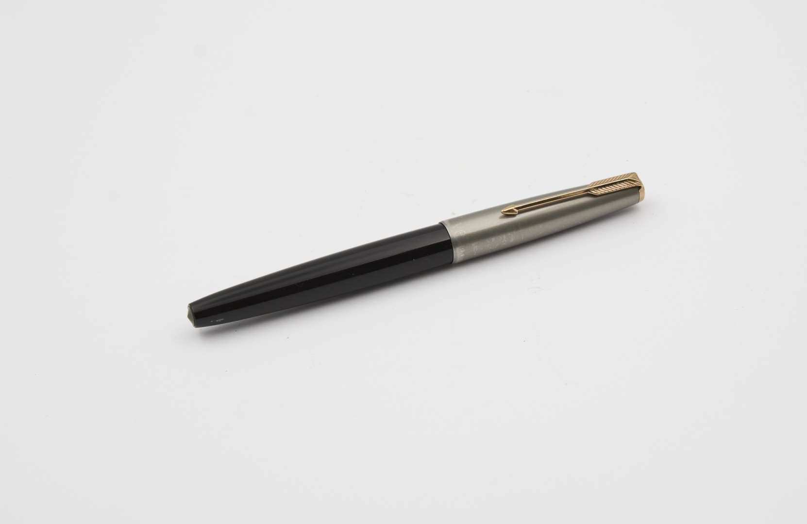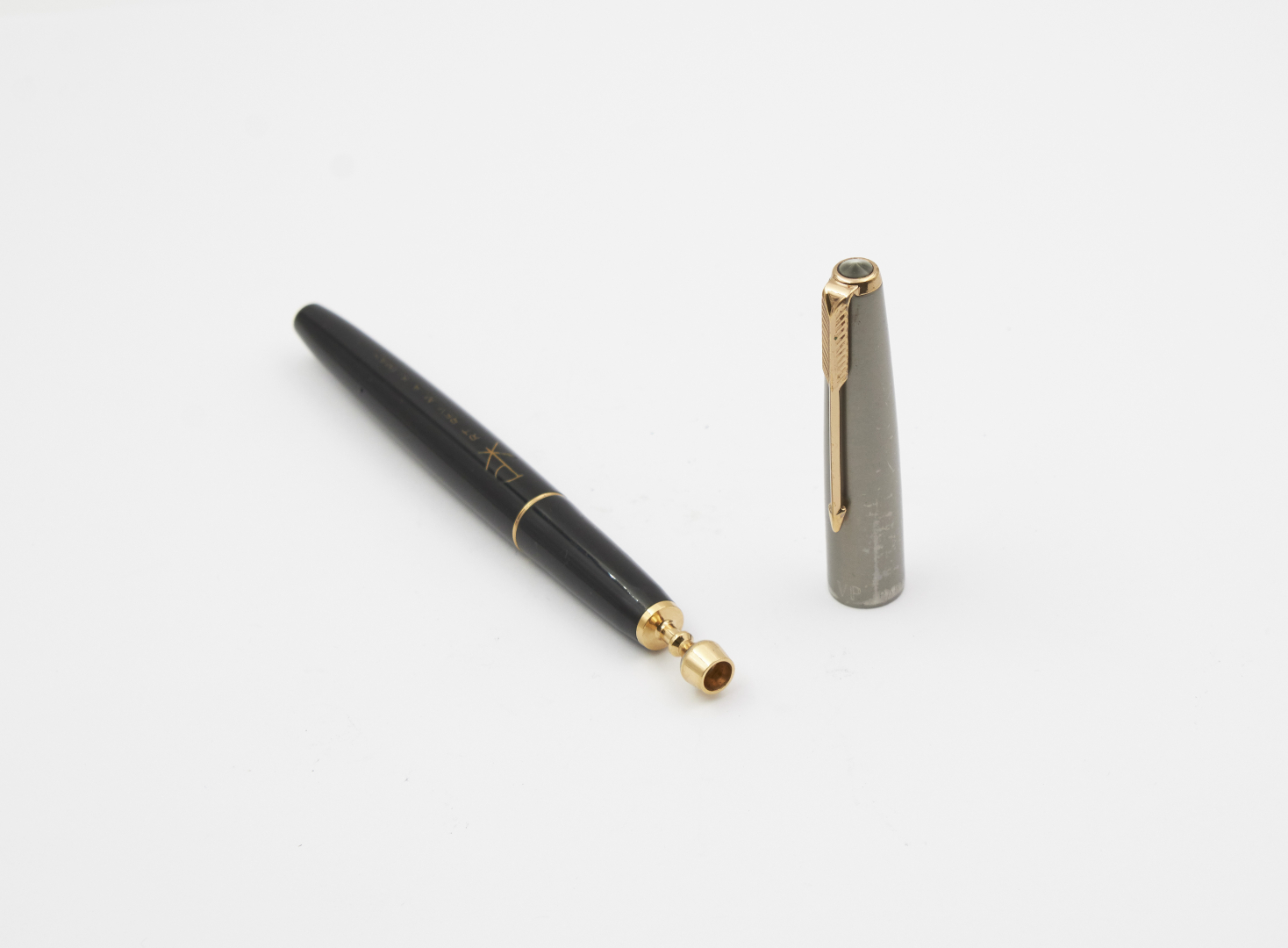 Chalice-shaped tip, pressure sac filling system, black resin body and metal cap engraved with the Christogram “PX” and “RT. REV. M. A. KLIMAS”.