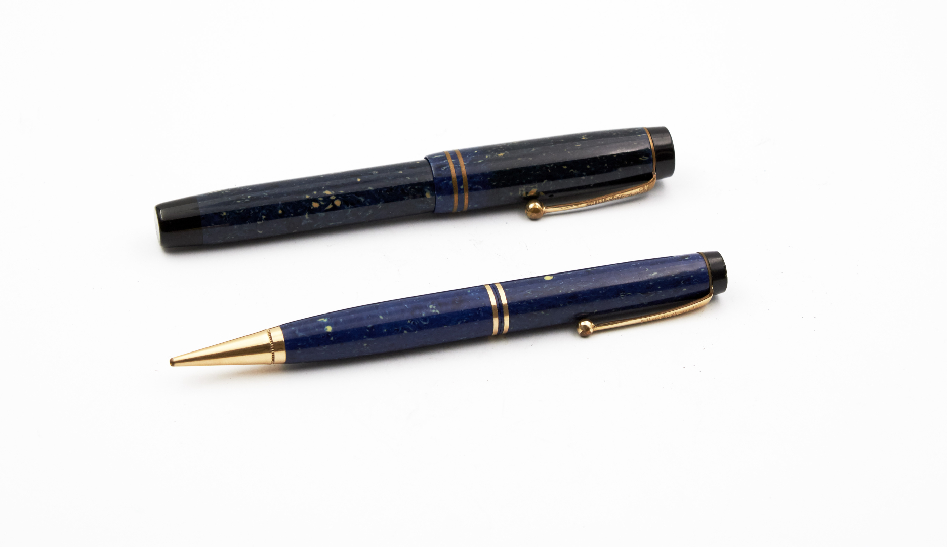Signed gold nib, presumably B size, button filling, lapis lazuli blue-colored celluloid.